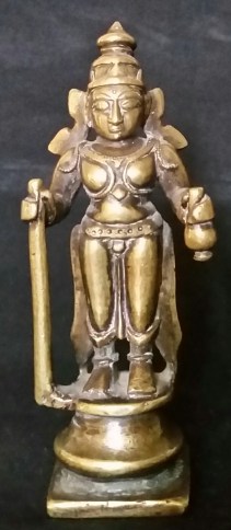 Holding a staff in his right hand and water carrier (Kamandala) in his left hand, Siva is shown as an ascetic. The usual attributes of Siva (Trishul, Mirga, Drum) are not present in this bronze. It is…