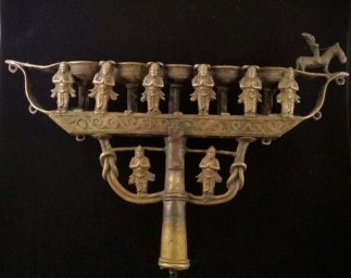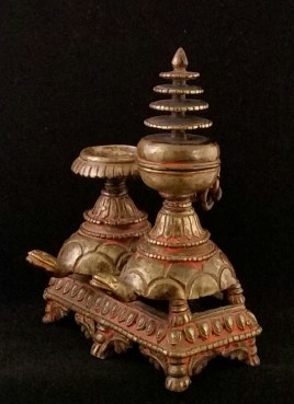 This is an oil and wick lamp used in temple processions. The portion shown above is normally mounted on a long pole and carried in temple processions with the lamps lit. Boat lamp is the modern nam…