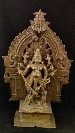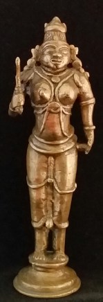 This folk bronze is identified as Karuppuswamy, a village guardian deity from Tamil Nadu, in South India. Karuppuswamy in Tamil means ‘black god’. The identification is based on similar…