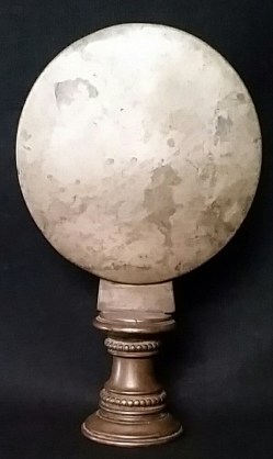 One of the simplest bronzes in my collection. A circular metal surface supported by a multi-leveled patterned cylindrical base. This is altar mirror from Nepal. This is referred to as Jwalanhayakan…