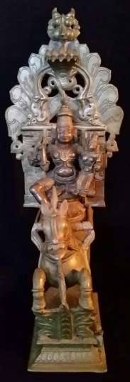 This is Khandobha and his consort Mahalsa riding a horse. This is one of the popular depictions of them. Khandobha is identified by his vahana, a horse, and by his attributes, a sword and a shield.…