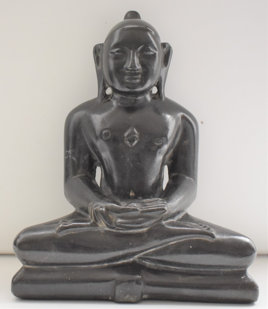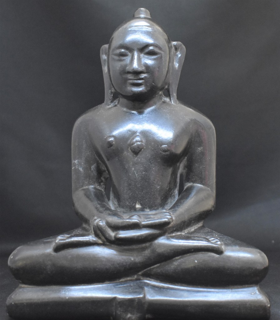 This is a sky-clad (Digambhara) sect Thirthankara is sitting in Ardhapadmasana with his hands in yoga mudra.