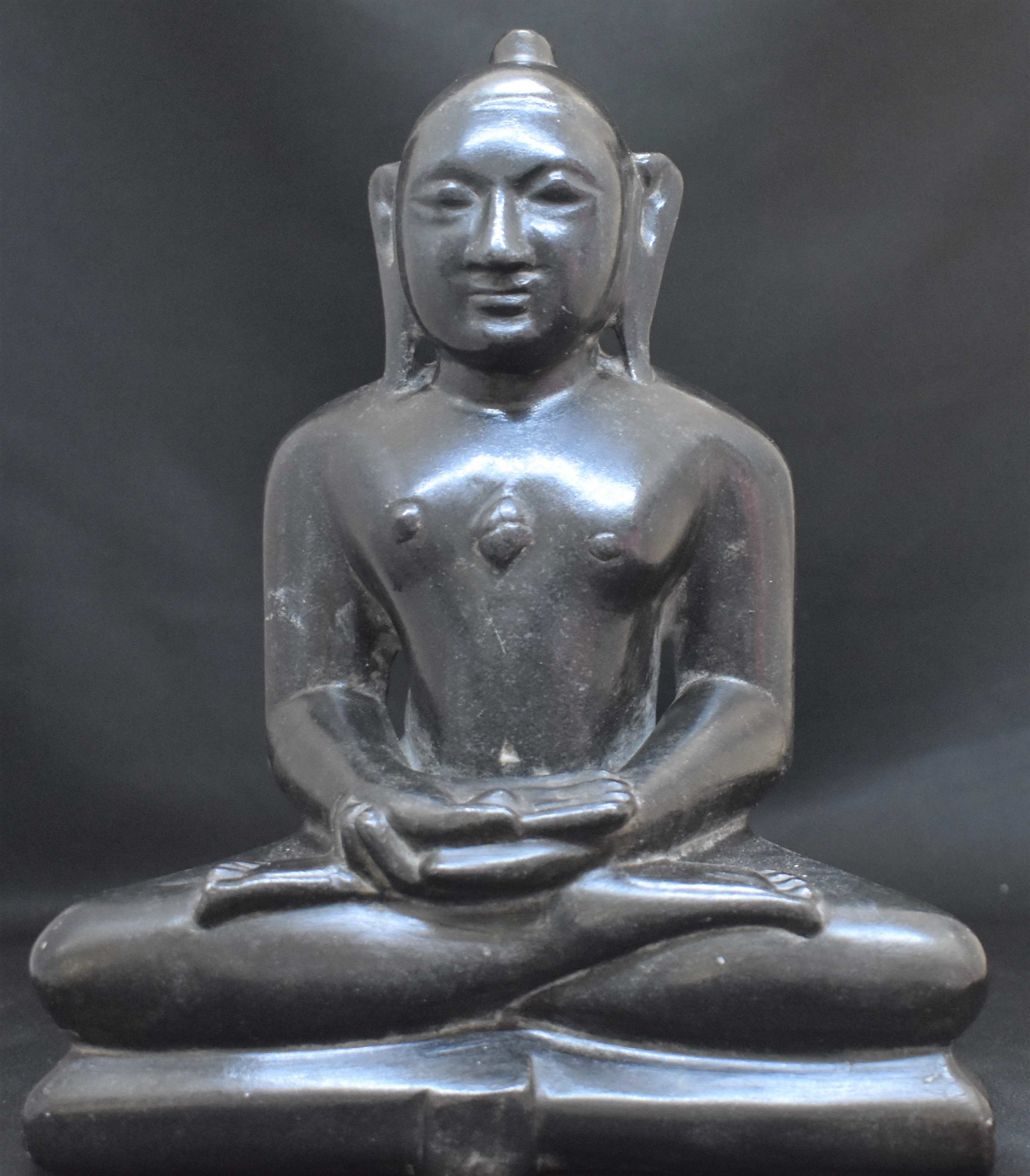 The long ear lobes are considered one of the Lakshans. The bump on the cranium indicates that he has surpassed the bounds of ordinary human beings. Though you see quite a few Thirthankaras with curled hair, the absence of hair here should not be a surprise. The Jain monks remove their body hair by plucking them. The absence of cognizance precludes the identification of the Thirthankara.