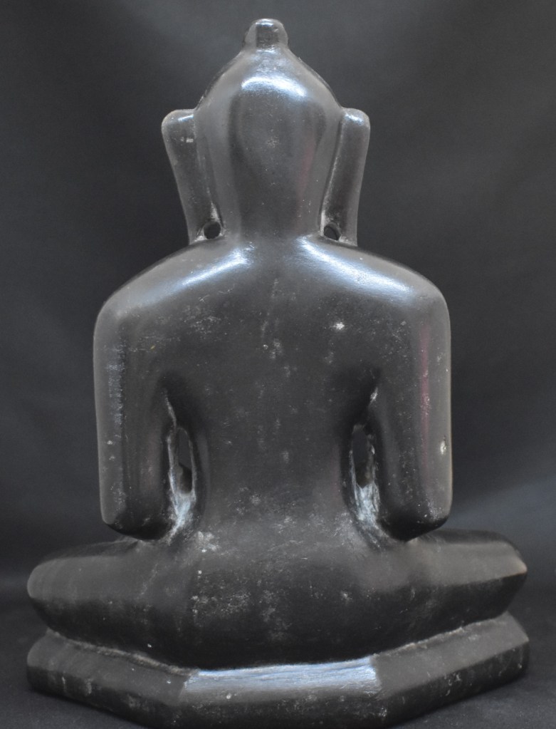 This Thirthankara is from Western India, possibly Rajasthan. The cranial bump is common in the Thirthankara sculptures from Central and Western India since the 5-6th century CE. Surprisingly cranial bumps are less common in Thirthankara sculptures from South India.