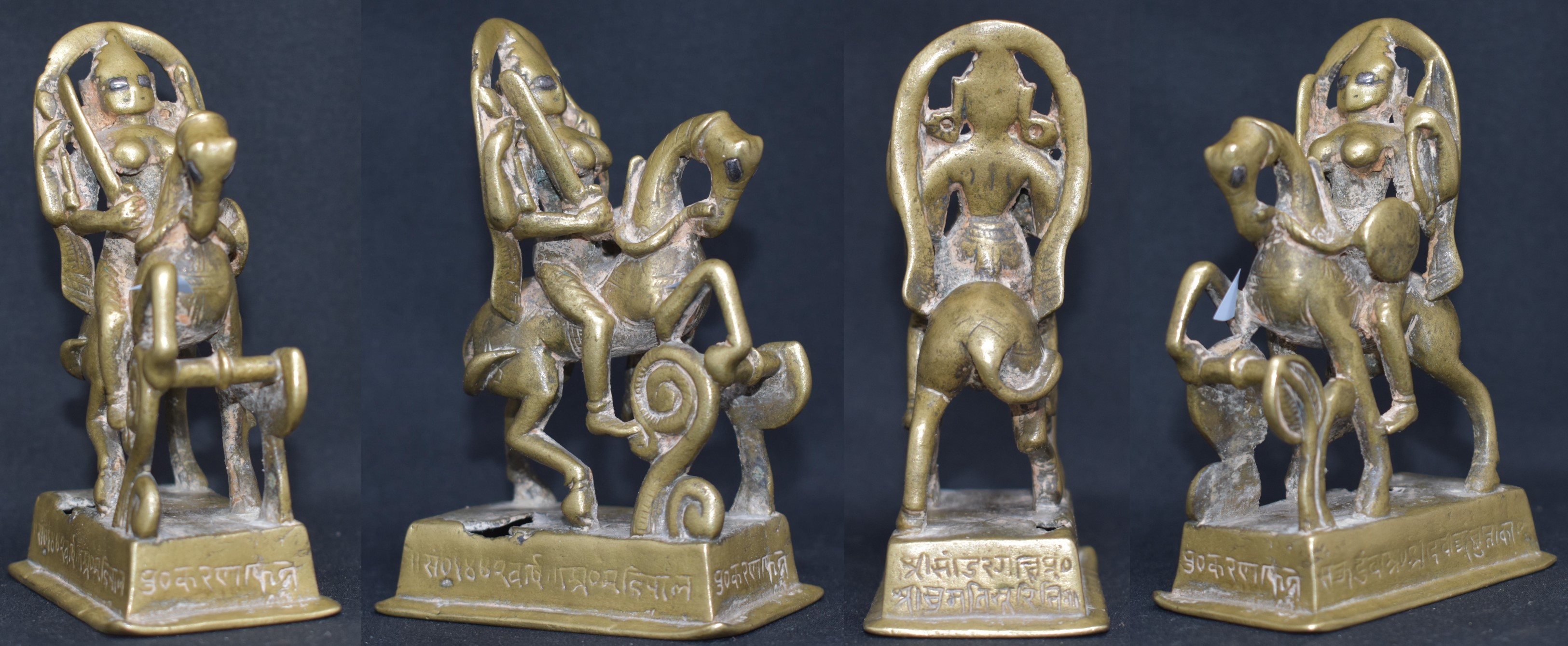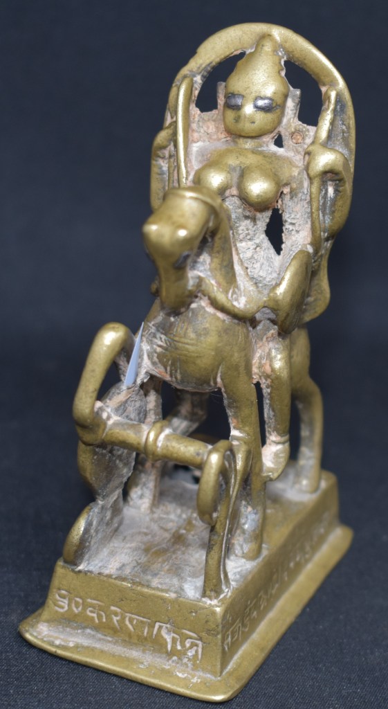 Here riding a horse, the four-armed goddess seems to be negotiating a ‘fence’. Inlaid eyes and inscription all around add to the charm and mystery.