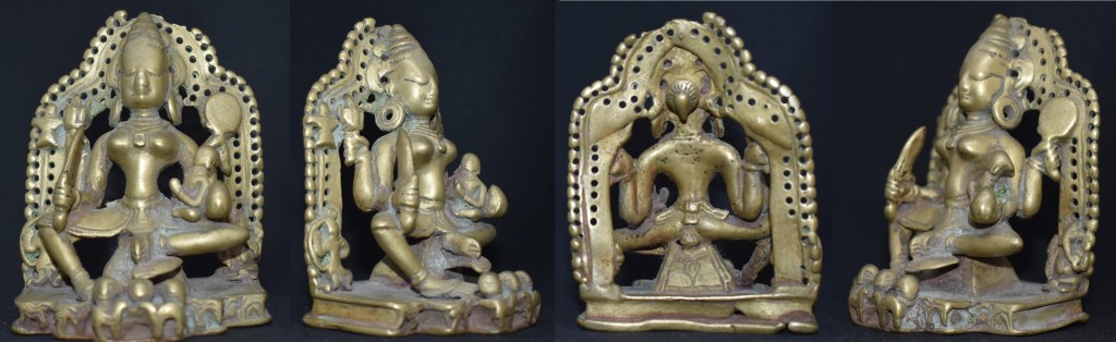 Here Ambika is holding a sword, a lotus (possibly), a mirror and a fruit. Clockwise starting from the lower right hand. Normally Ambika’s attributes are mirror, sword and shield. Hence the tentativeness in the identification. This is one more Goddess, from the Sakta tradition, with three severed heads on the pedestal. The ‘mystery’ as to what/who the three heads represent remains unsolved. For some of the other examples with me, please see the post of Mother Goddess.