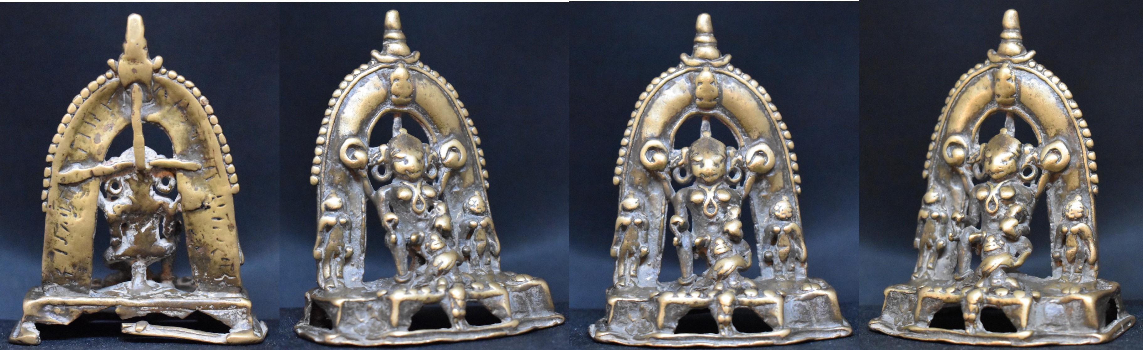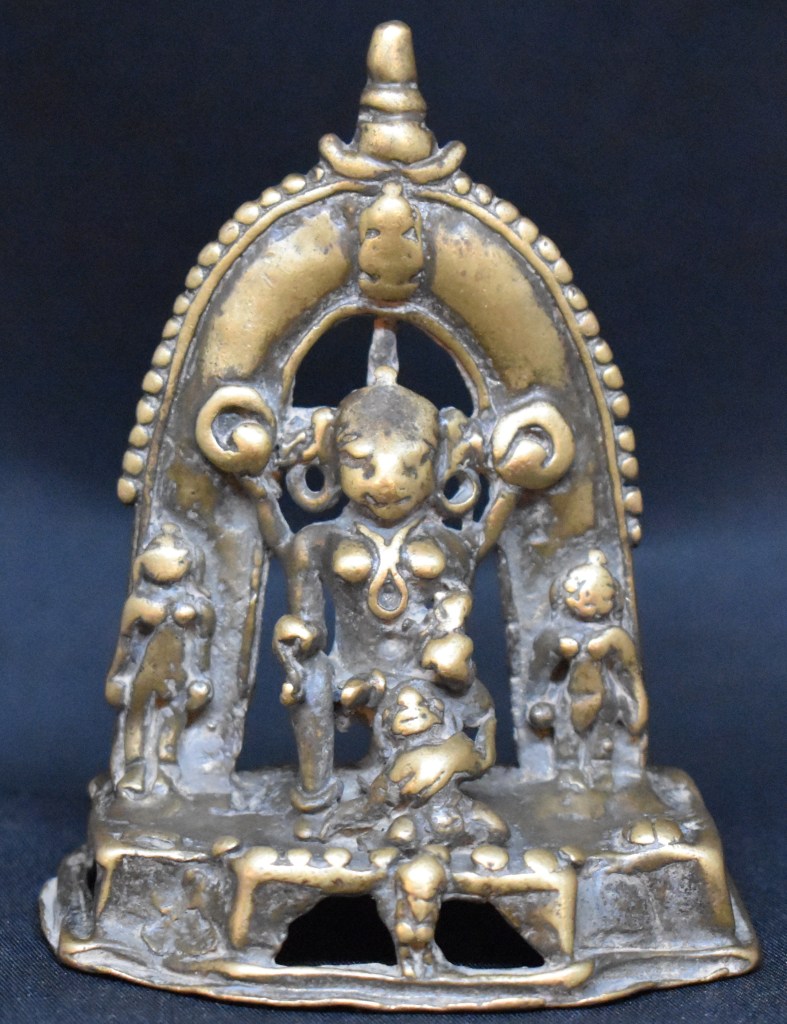 The presence of nine balls/beads on the front rim of the base is an unusual addition, especially for an ancillary deity. Normally you see this feature, representing Navagraha (nine planets), in Tirthankara bronzes.