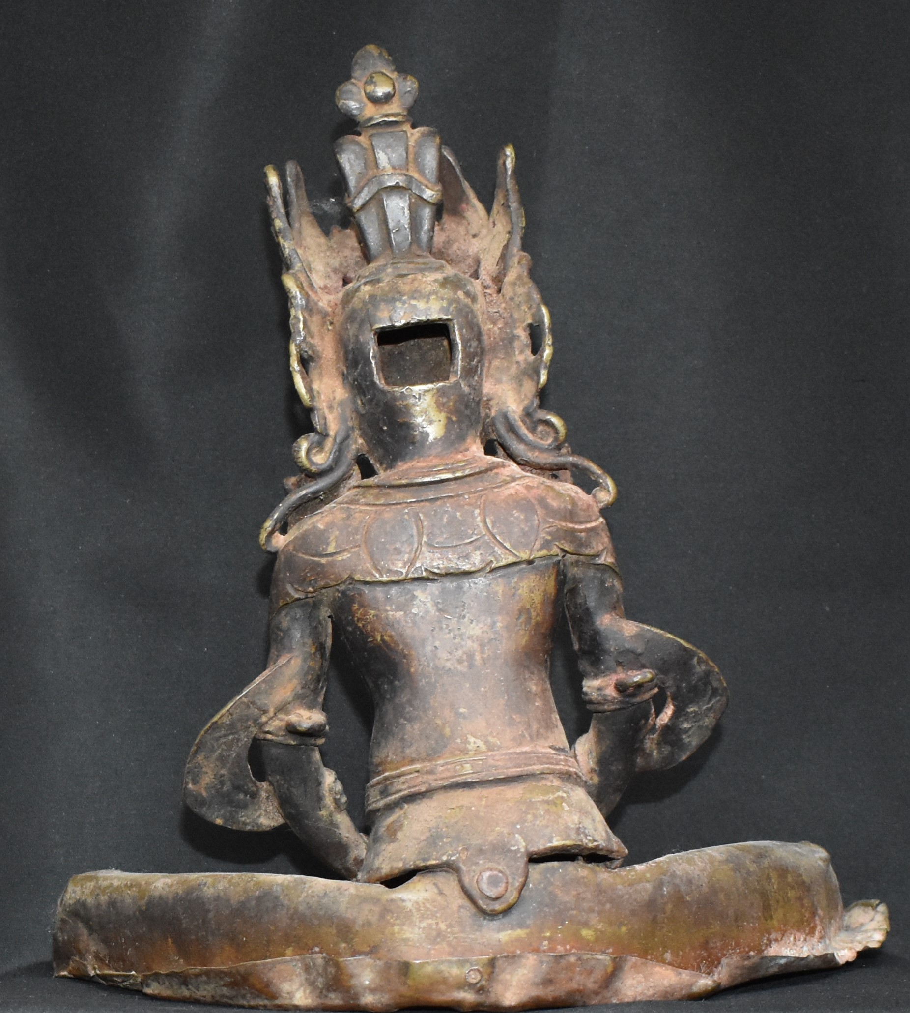 This is two-piece construction. See the back view for the details. The top portion, up to the hip, is hollow cast. The bottom portion is made using repousse technique and the patterns on the lower garment are engraved. The alloy of the top portion and the bottom portion may be slightly different.