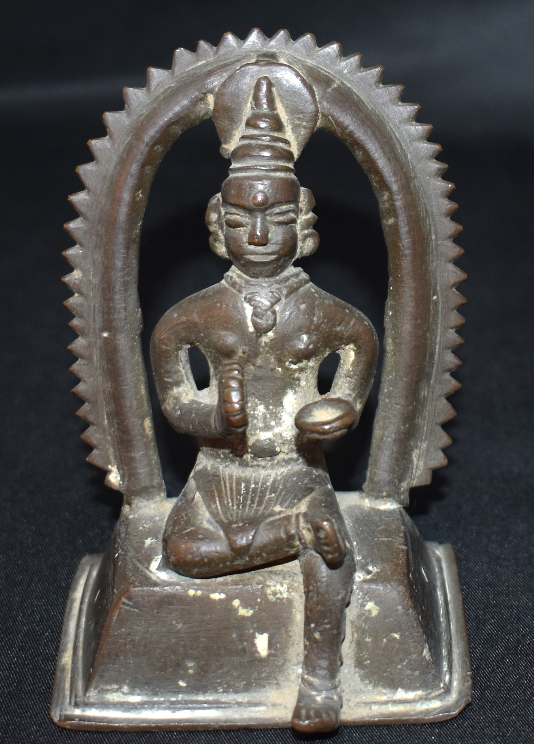 Going by the Akshamala (prayer beads) and holding a bowl in his hands he is ascetic. But with a difference. He is crowned and is sitting in Virasana, a posture commonly adopted by the Royalty. Of course, Vyakyana Dakshinamoorthy adopts this form.