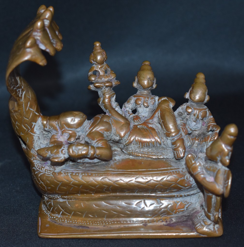 The crossing over the left leg, material and the peetha suggests this is from Karnataka. This may be dated to the seventeenth century or a bit earlier. The Vigraha is about 11 cm tall and 11 cm wide. The crossing over the left leg is typical of Deccan/Gujarat Aanathasai.