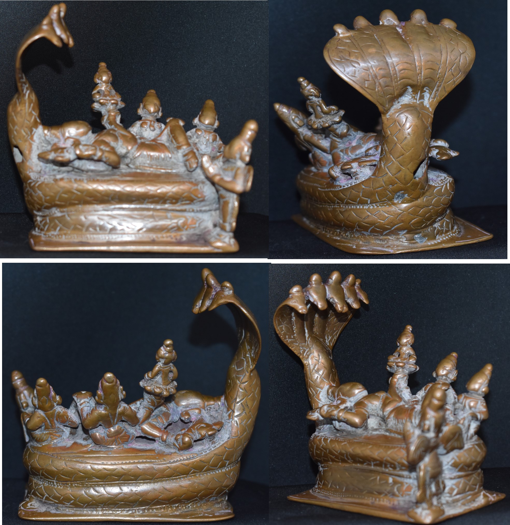 The bronze loss, wear to faces and the whitish deposits suggests a lengthy period of worship. The deposit is due to minerals in the water used for ritual cleaning. I made a weak attempt to clean it, without success. I decided to enjoy it as it is as I realized I cannot clean it without affecting the patina.