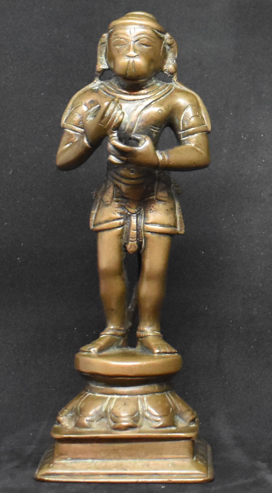 Anjaneya is standing on an inverted lotus and which in turn is supported by a rectangular pedestal with incised patterns. Anjaneya is wearing a short dhoti and the ornamentation is complete. His tail hanging loosely between his legs goes with the show of reverence and devotion.