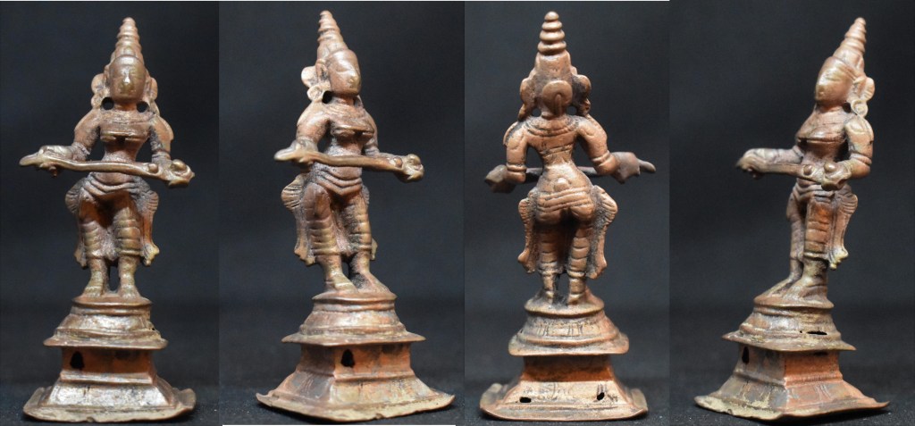 While Annapurna is revered throughout India, the majority of the bronze representations we encounter originate from Maharashtra or the Western Deccan. However, this particular Vigraha originates from Tamil Nadu, evident through its distinct features such as the Tribanga pose, Kosavum (the small projecting part of the saree at the back), the base design, and the style of the crown. Further details about Annapurna can be found in another blog dedicated to her.