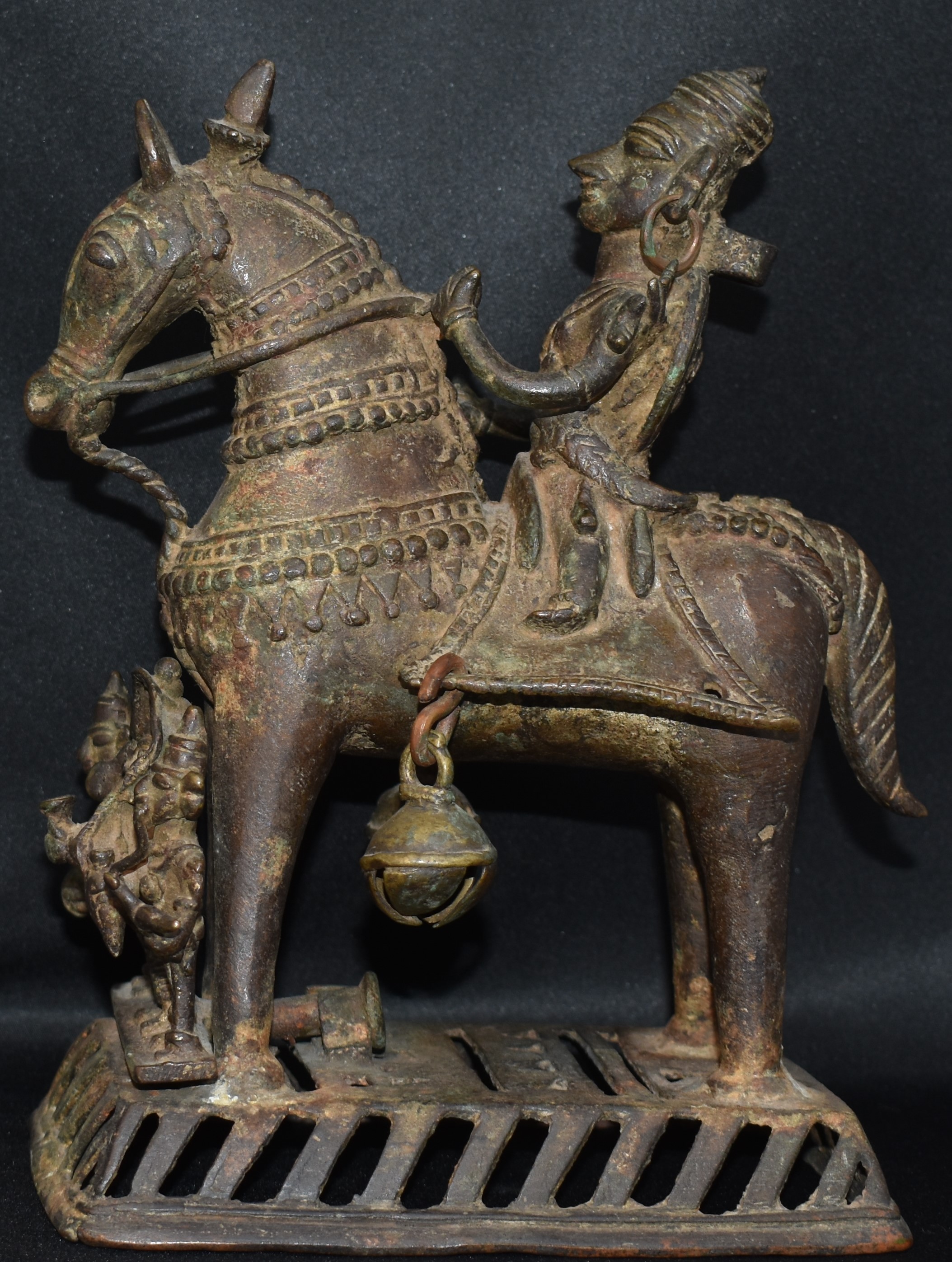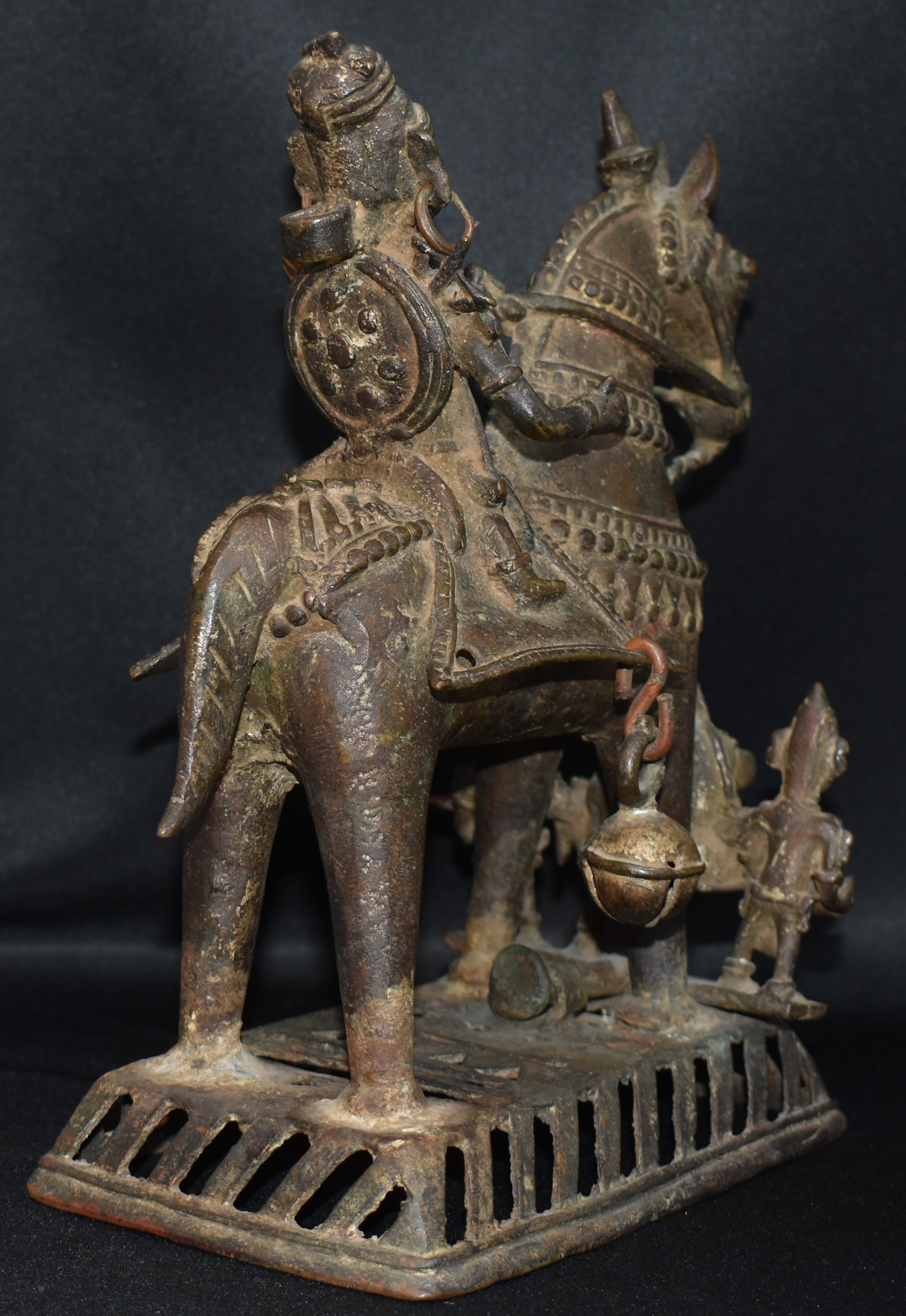 The horse is fully caparisoned and it includes four layers of chain on his neck and torso. Note the way the decorated saddle is fixed, projecting out. Two of the bells are missing. The horse is solid cast and is standing on a rectangular platform with openings. With the decoration and the robust size, the horse takes the central stage in this composition.
