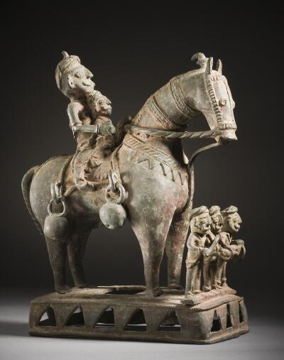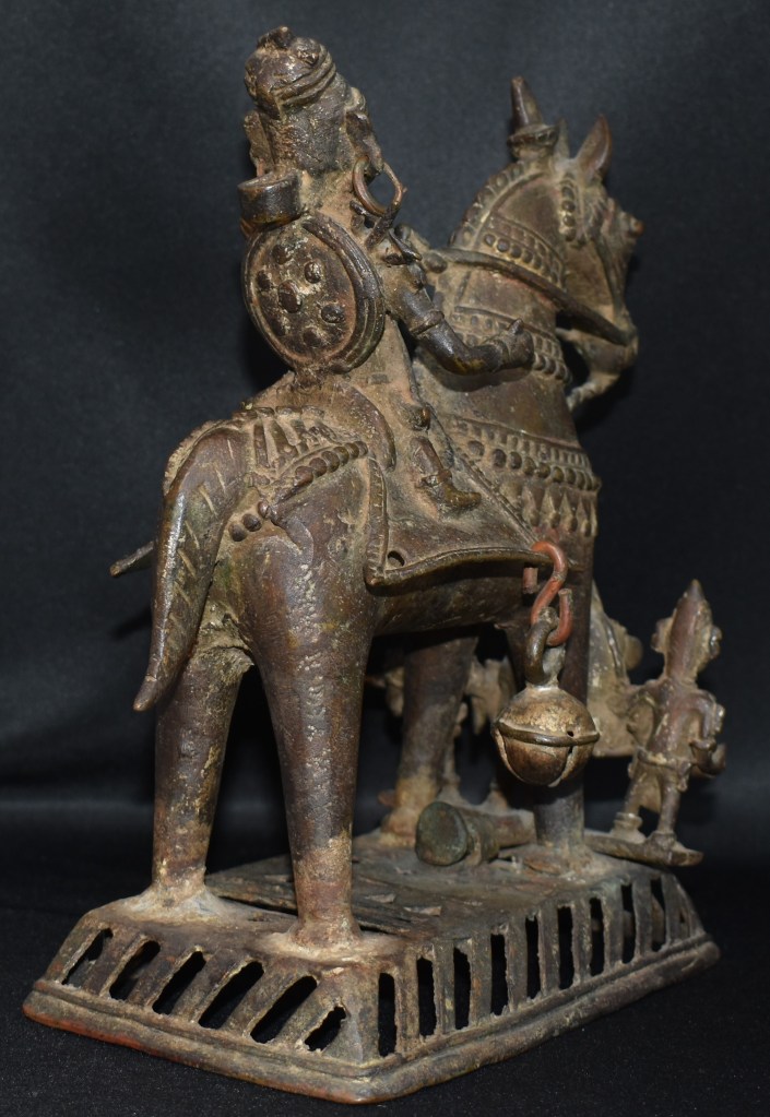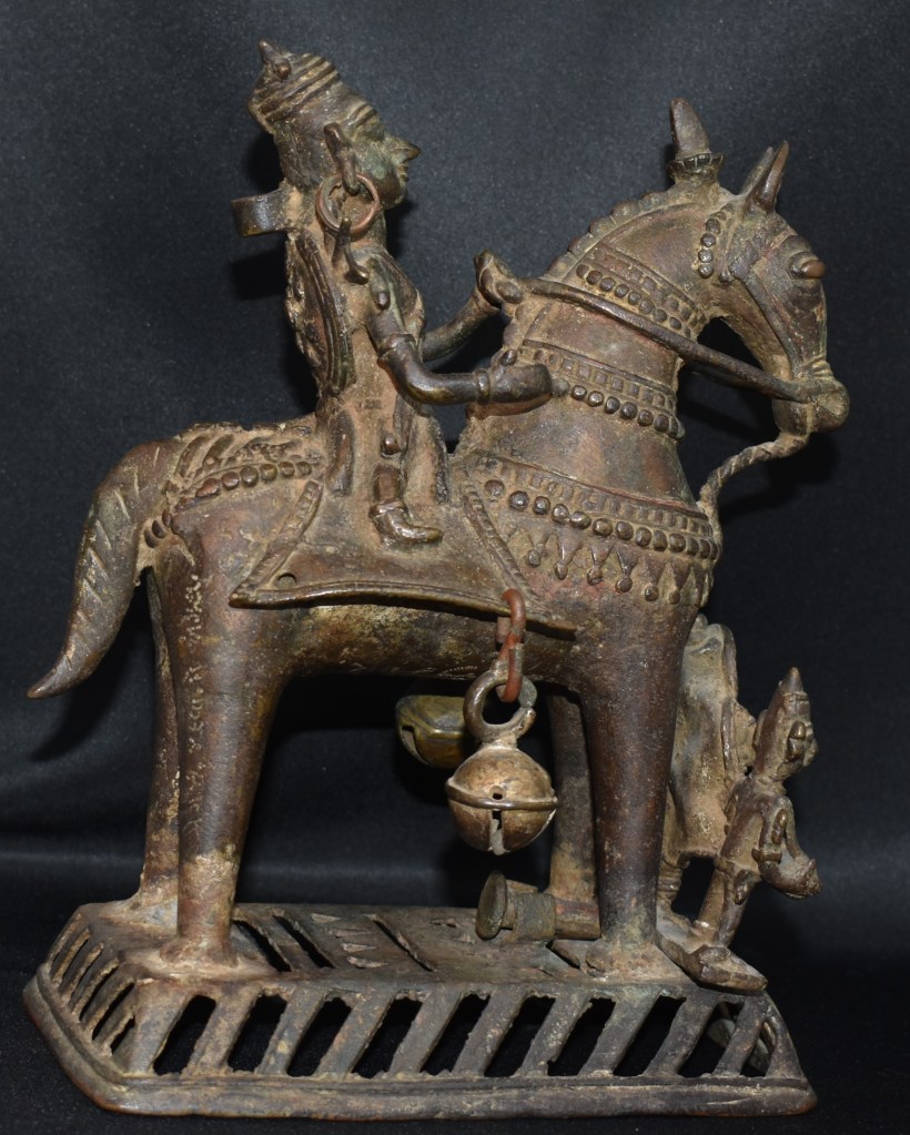 This is, probably, Ayyanar a village guardian deity (Grama Devata) from Tamil Nadu, India. A folk bronze at its best. An example is included. Thanks to: http://www.findmessages.com/ayyannar-temple-horse-of-shri-kaliyugavaradha-ayyanar-temple
