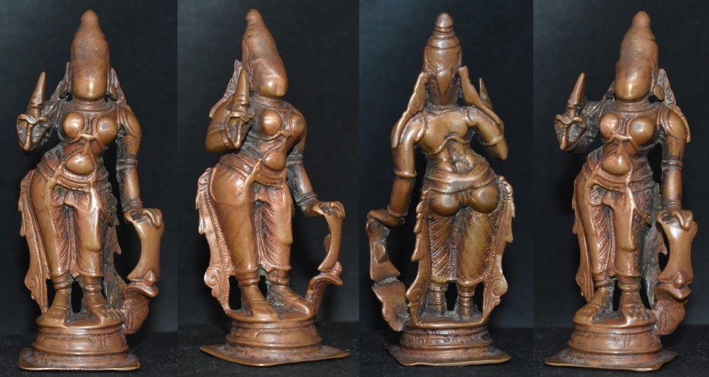 The Vigraha is about 10 cm in height and has a lot of Tamil Nadu features (Engraved pedestal, copper rich alloy, high crown and the Kosavum at the back). Based on the wear and style eighteenth century dating is suggested.