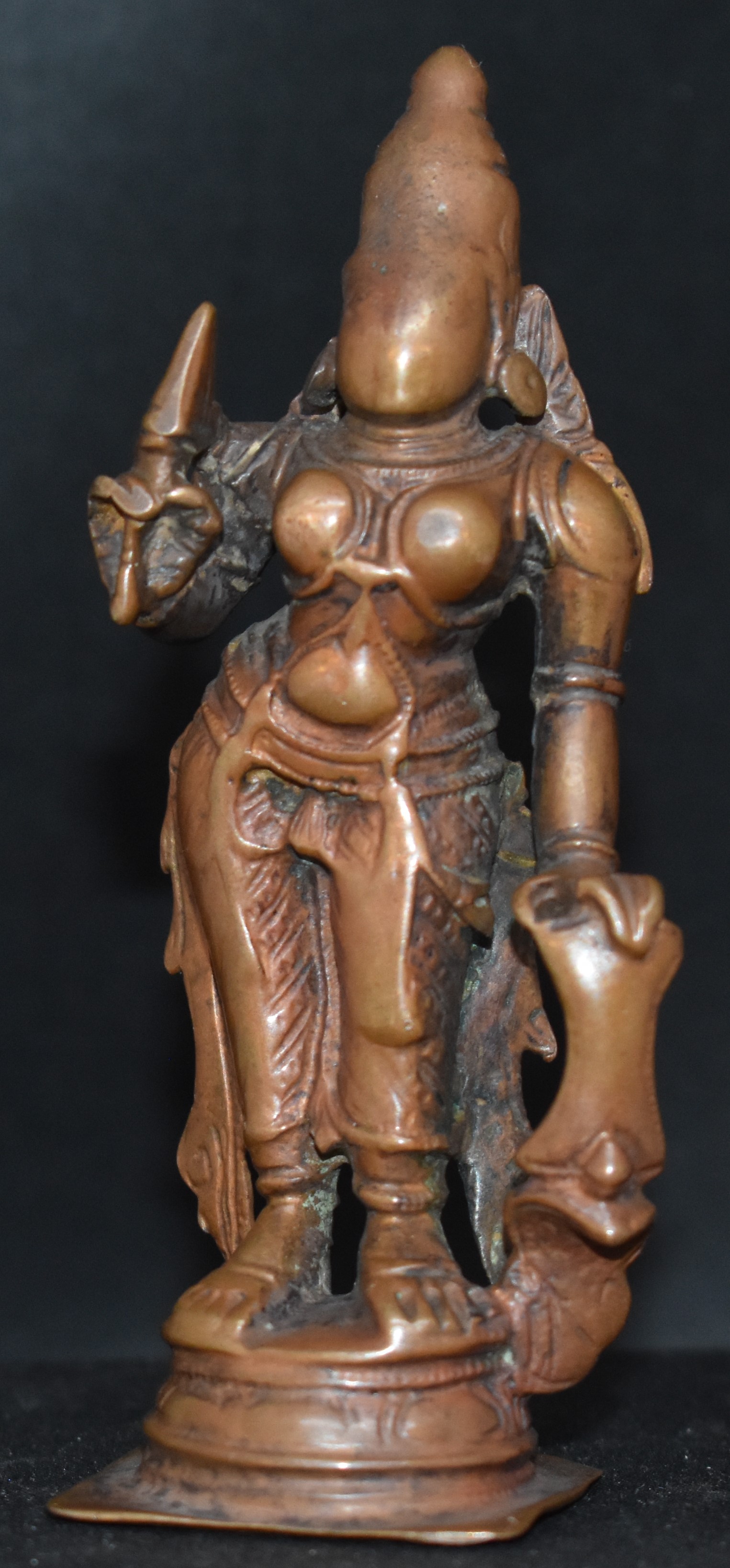 The Vigraha is about 10 cm in height and has a lot of Tamil Nadu features (Engraved pedestal, copper rich alloy, high crown and the Kosavum at the back). Based on the wear and style eighteenth century dating is suggested.