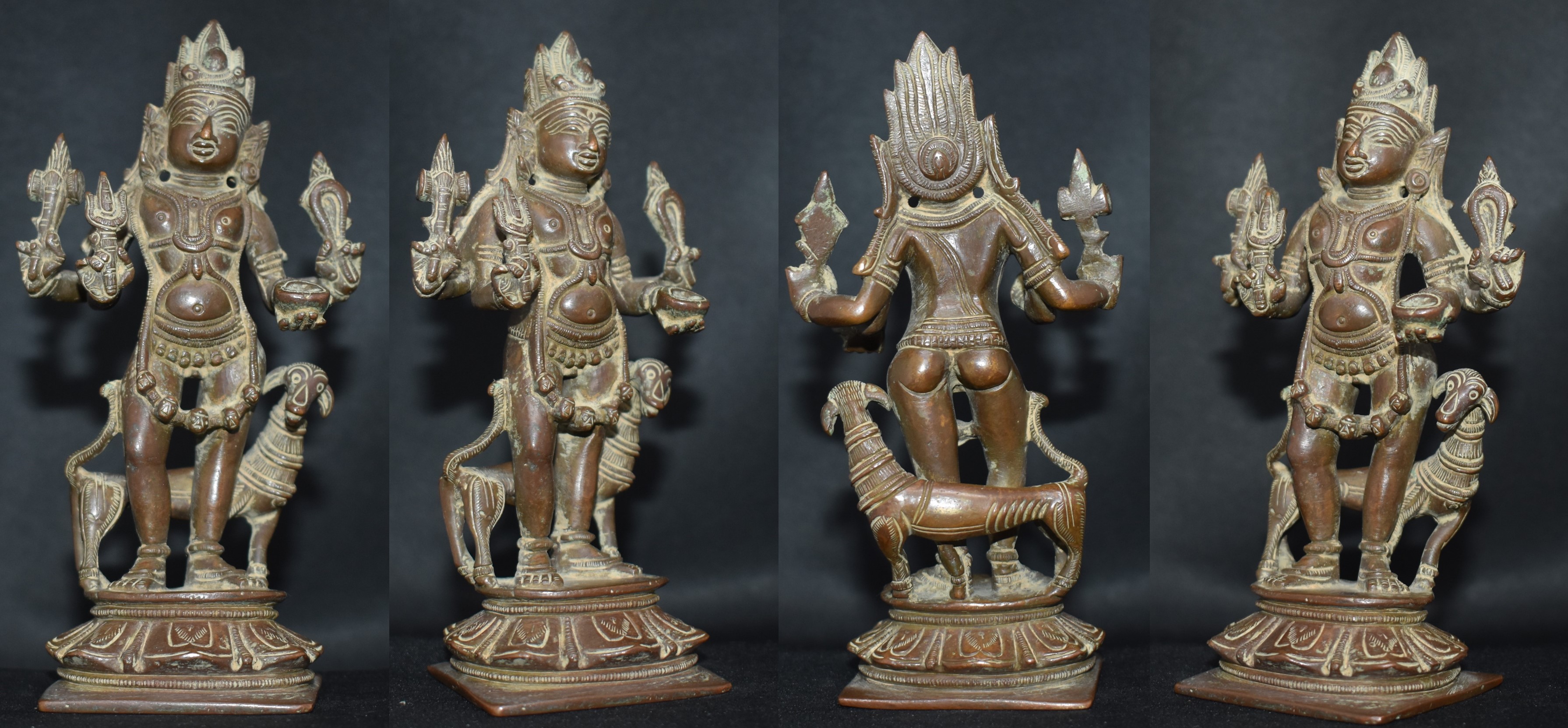The Vigraha is about 12 cm in height. It is from Tamil Nadu or the nearby areas. This Bhairav may be dated to the eighteenth century or a bit later.