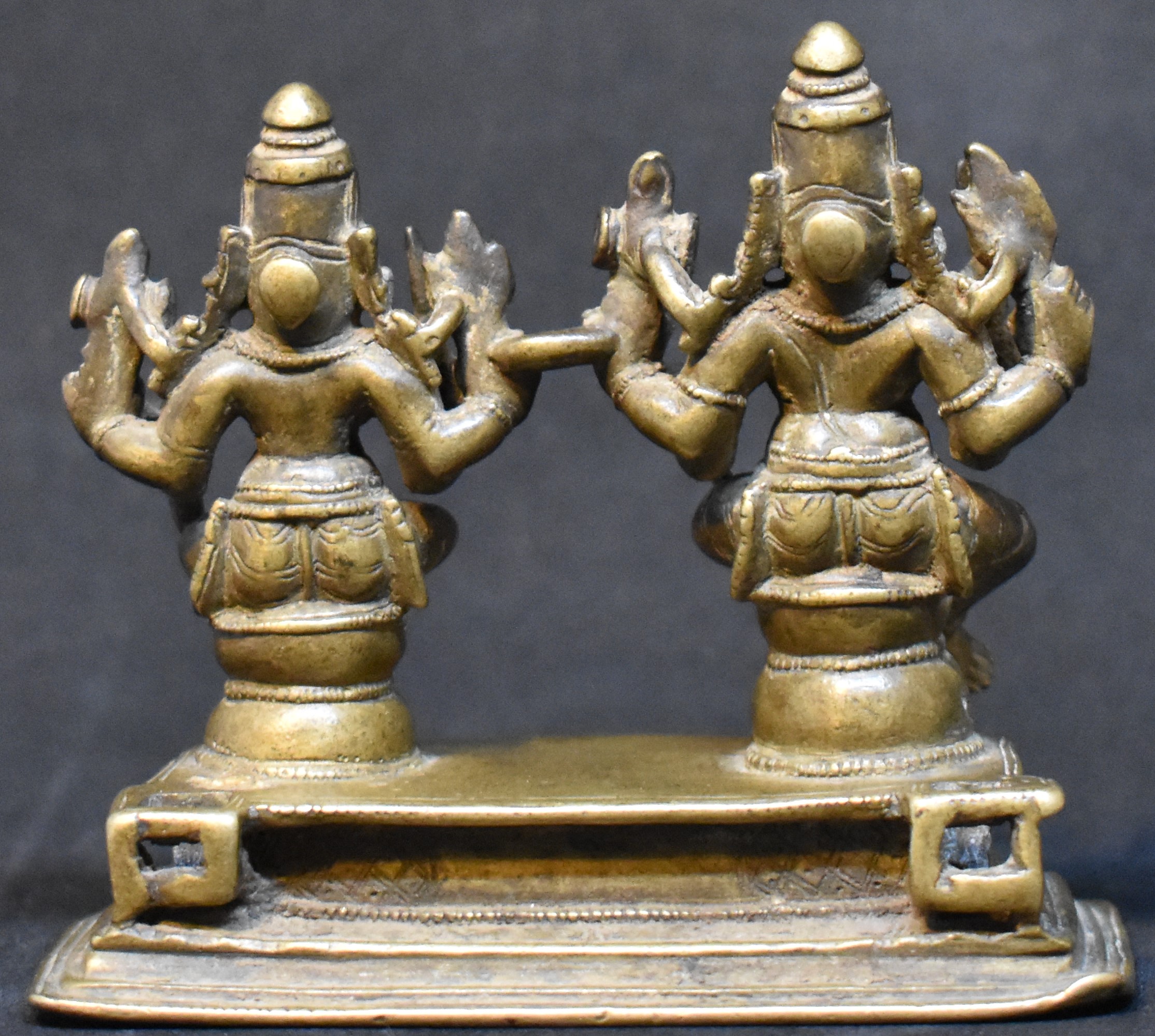 Bhairava is sitting in Lalithasana and whereas Bhairavi is sitting in Ardha Padmasana. They are on hour-glass shaped base which in turn is supported by Bhadrapeetha.