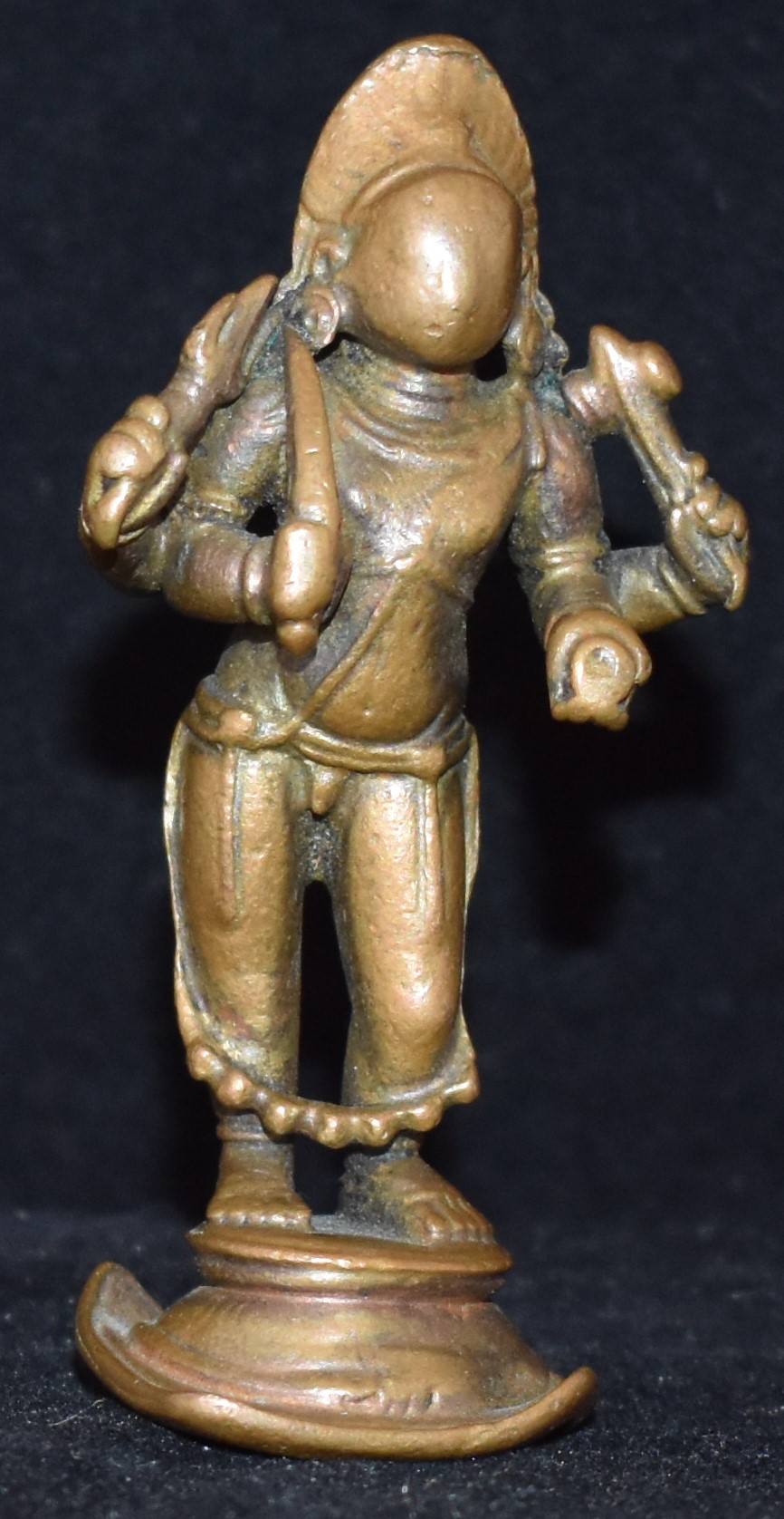 This miniature bronze, just about 6.5 cm, may have served as a personal icon in a home altar. He is holding a sword, Trishul, drum (Khadga) and cup (maybe skull), starting lower right hand in the clockwise direction.