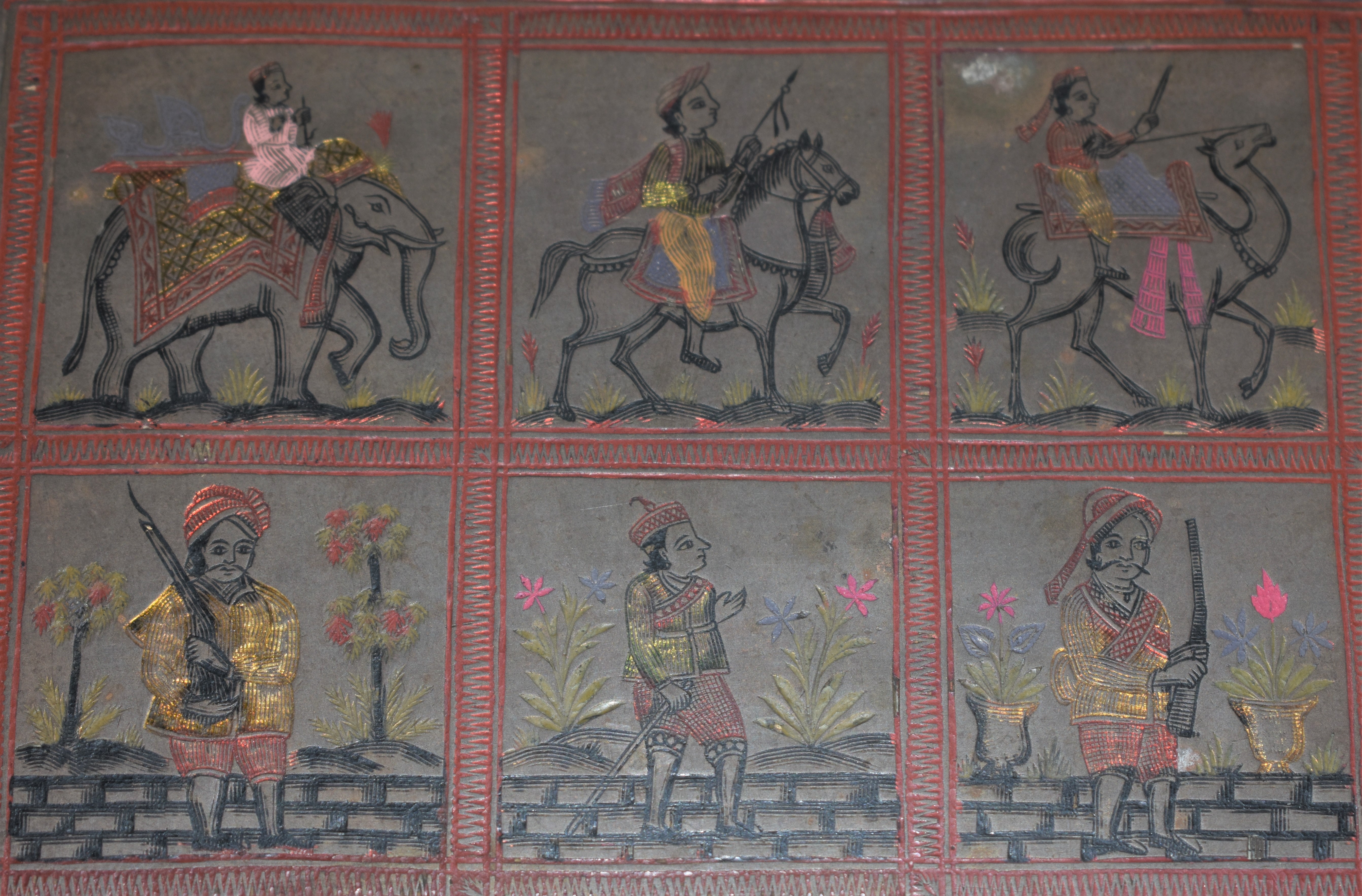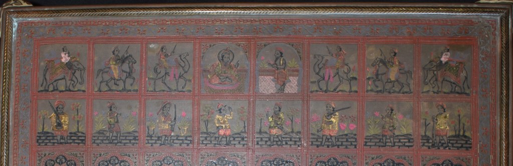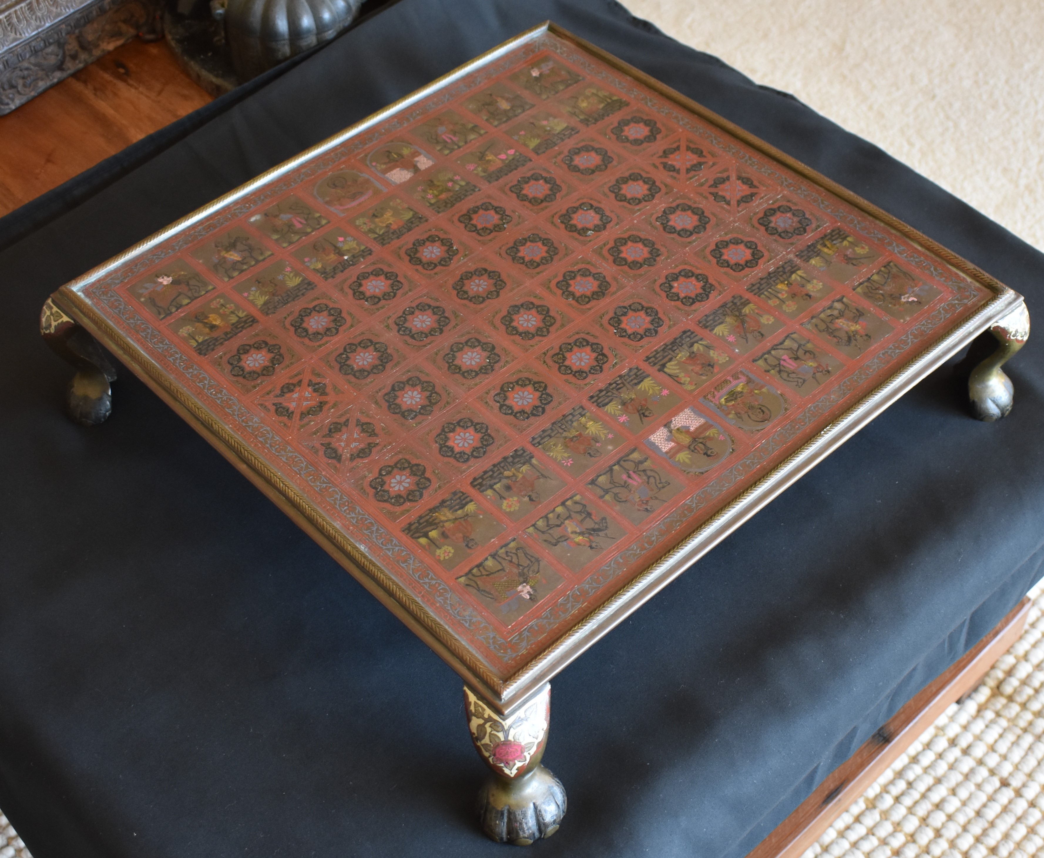 A chessboard made of brass with exquisite enamel work. The chessboard may be dated to the colonial period and it is heavily influenced by Rajasthani/Moghul miniature paintings.