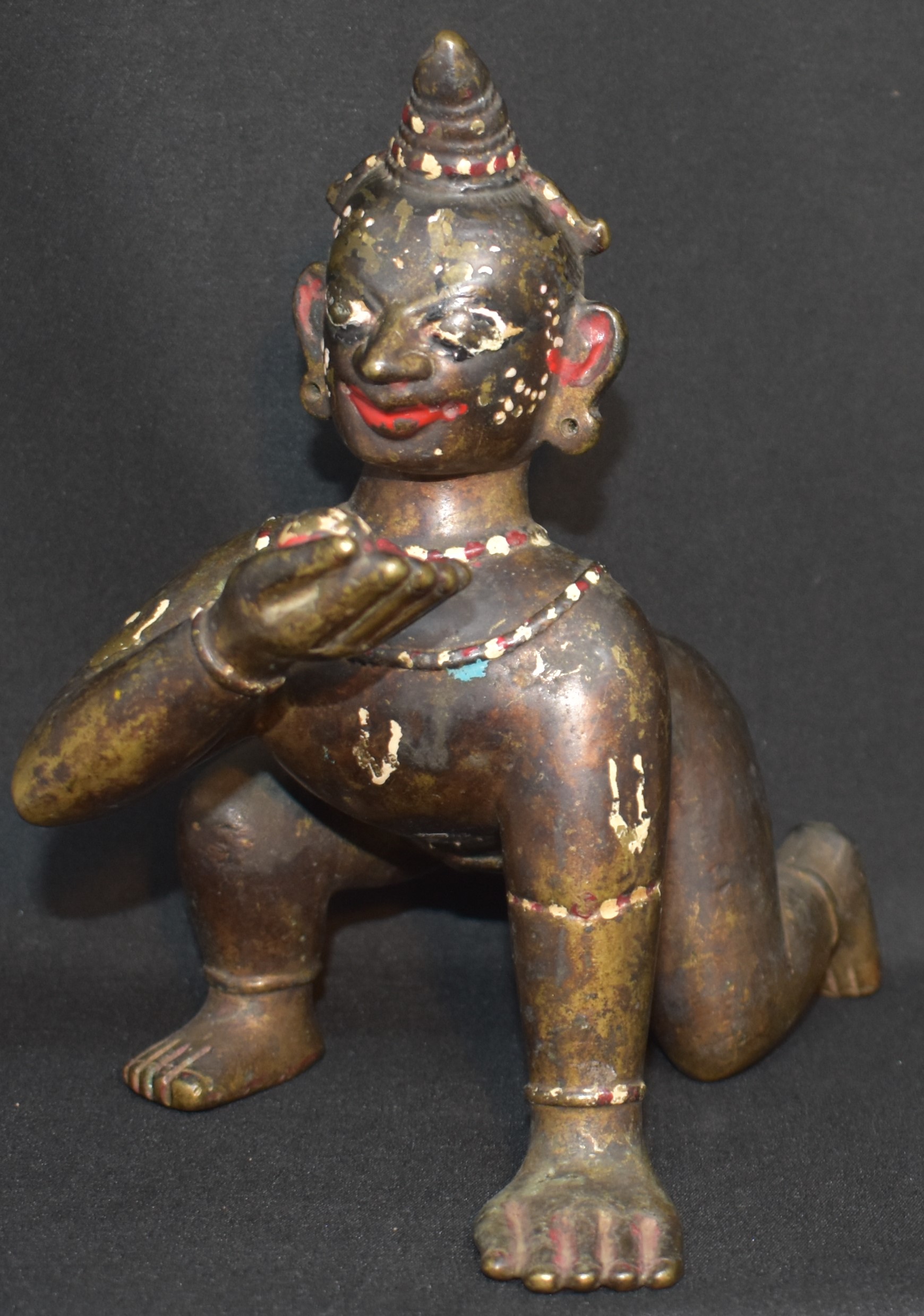 A typical representation of butterball Krishna, crawling on his fours and holding a butter ball in his right hand. This is the scene of his running away from his foster mother, Devaki, after stealing the butter ball.
