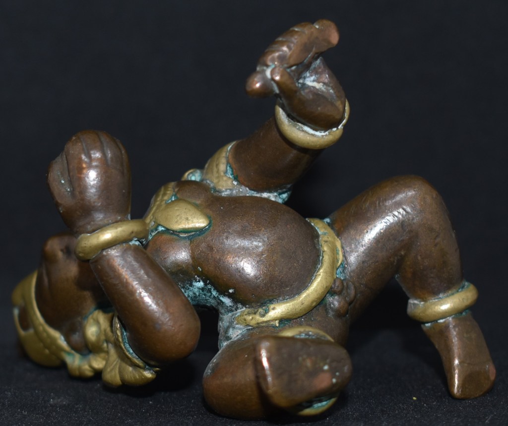 The patination is deep and the features are worn as a result of ritual cleansing. Normally Krishna is chubby. But not this one. The body is surprisingly toned.