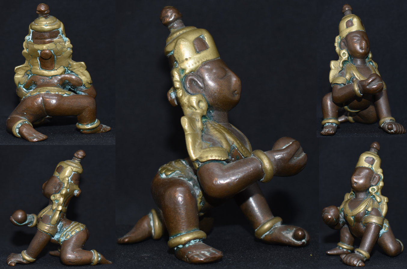 This is infant Krishna, holding the stolen ball of butter in his right hand, crawling to escape his foster mother Yasodha. Krishna is holding a flute (?) in his left hand. This theme is very popular throughout India and most of the Vigrahas of this type are small as they are meant for home shrines. Vaishnavites (Hindu’s who worship primarily Vishnu) invariably have one of this Vigrahas in their altar.