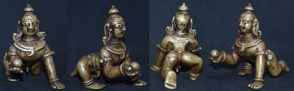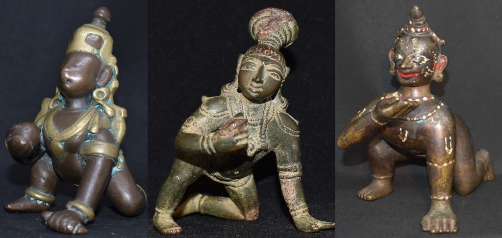 Three other examples of crawling Krishna with me are included below for comparison. From our left to right they are from Karnataka (Ganga Jamuna style), Tamil Nadu and Bengal.