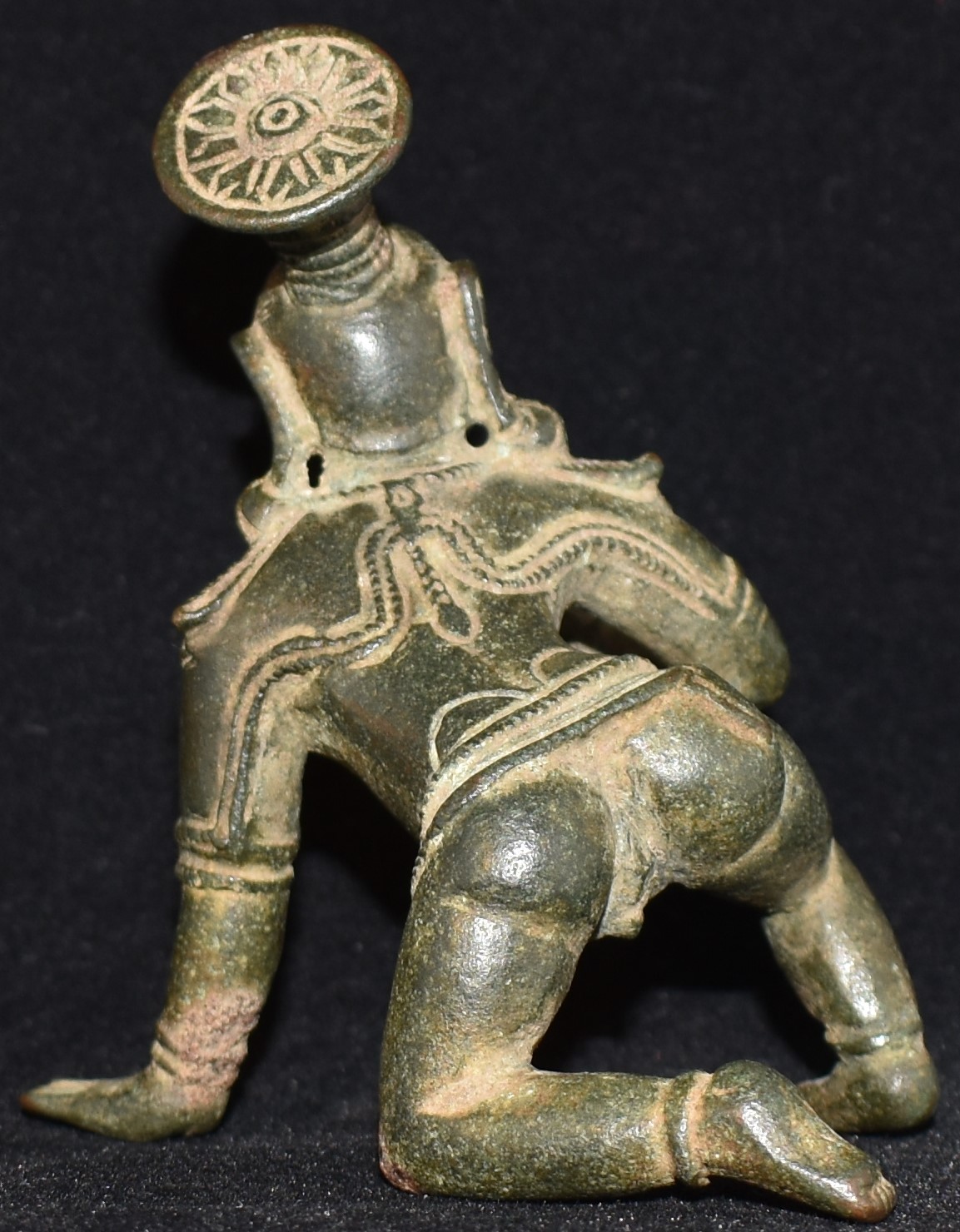 The bronzes height is about 8 cm and its length is about 7.5 cm. This is probably from the 17th/18th century. Origin may be Tamil Nadu.