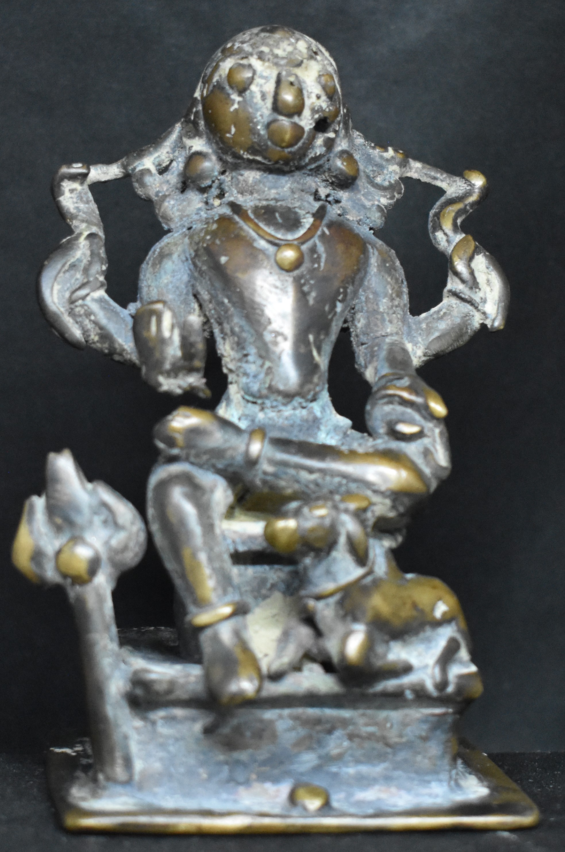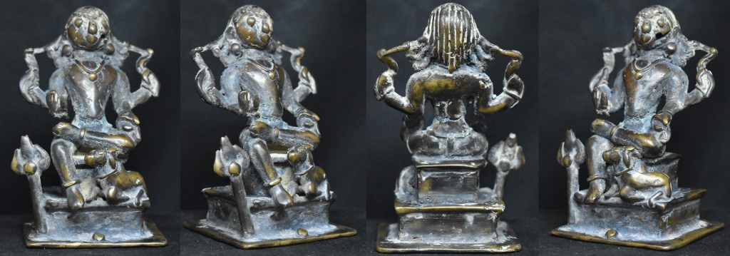 The folk style and the Trishul are unusual features of this bronze. Maybe they go hand-in-hand. In South Indian tradition, the Trishul is not featured. For more information on Dakshinamurthy, see this blog, Dakshinamurthy under a tree.