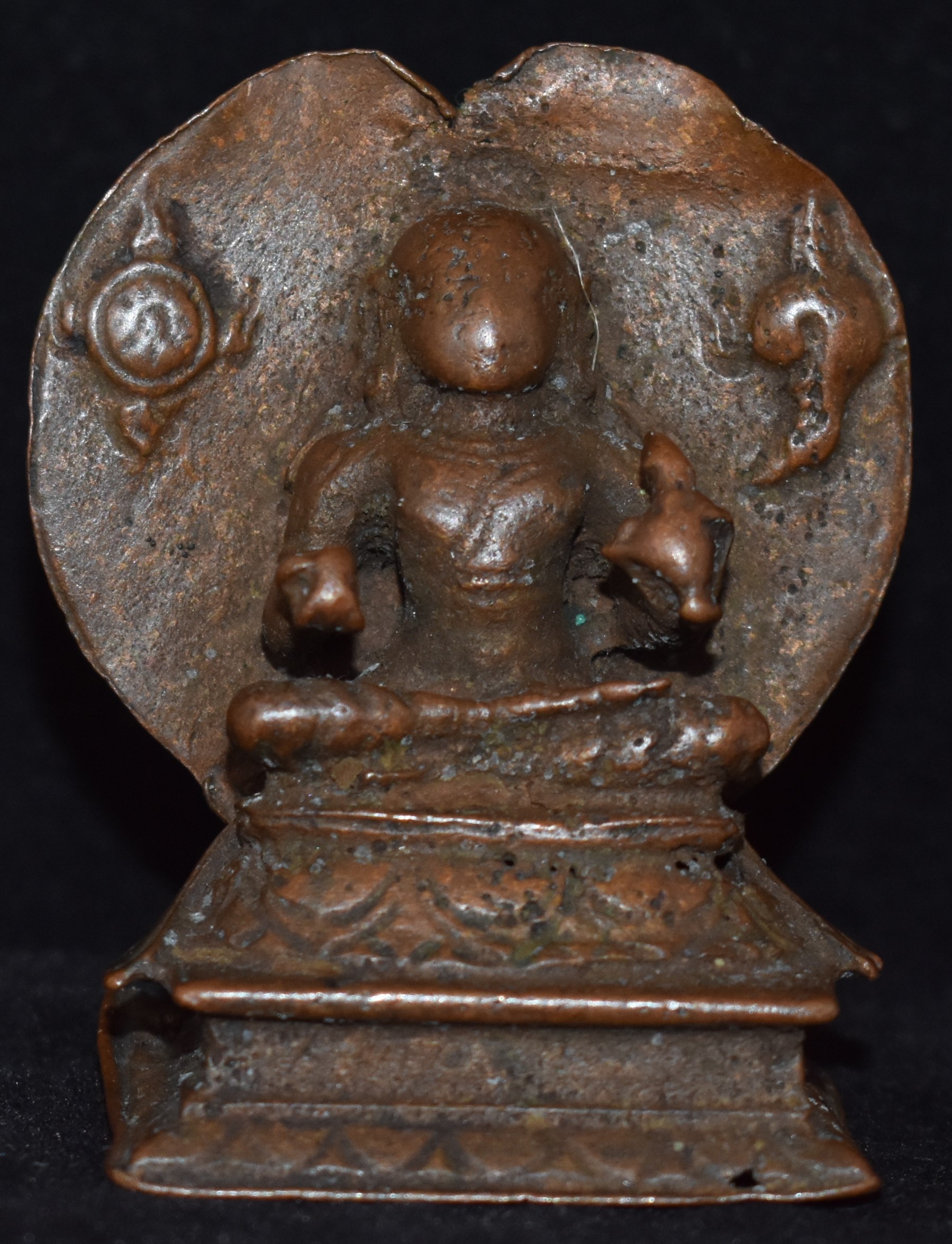In this bronze, Dhanvantri is shown seated in Padmasana holding a pot in his left hand and, possibly, a leech in his right hand. There is a halo behind him. The Chakra and Shankha, principal attributes of Vishnu, in the Halo associate him with