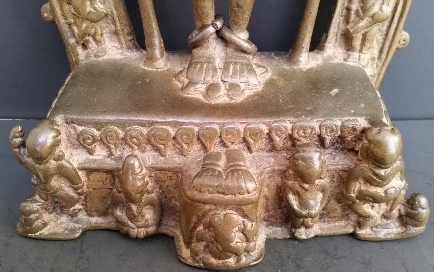 Normally in a bronze, the base is not decorated, barring images of donors and deity’s vahana. This piece is exceptional in the prolific number of images shown. The images at the backside of the base is in stark contrast to the featureless backside of the Prabhavali.