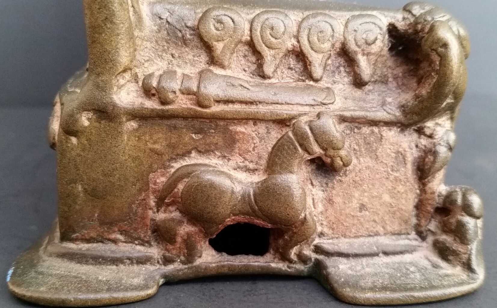 Now to the right side of the base. There is cantering horse. Just above the horse in the niche, there is sword. Above the sword on the side wall there are four swirls.