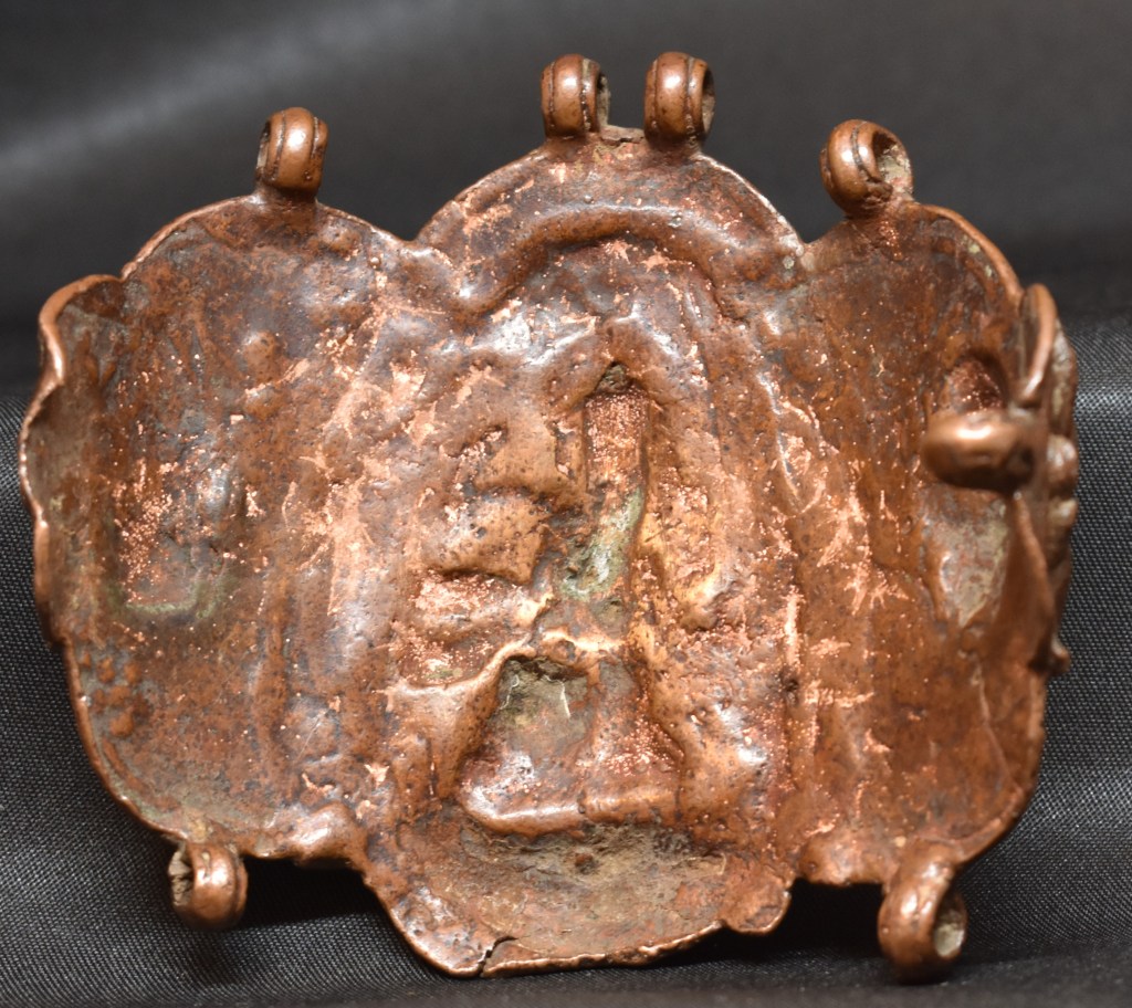 This is an armband from Nepal. It is worn by ascetics to declare their faith and affiliation to a particular sect. Here, the central figure is Durga. The eight-armed Durga is in Alidha pose with one of her legs on her vahana, a lion. Durga is flanked by Ganesha, on her right, and Anjaneya, on her left.