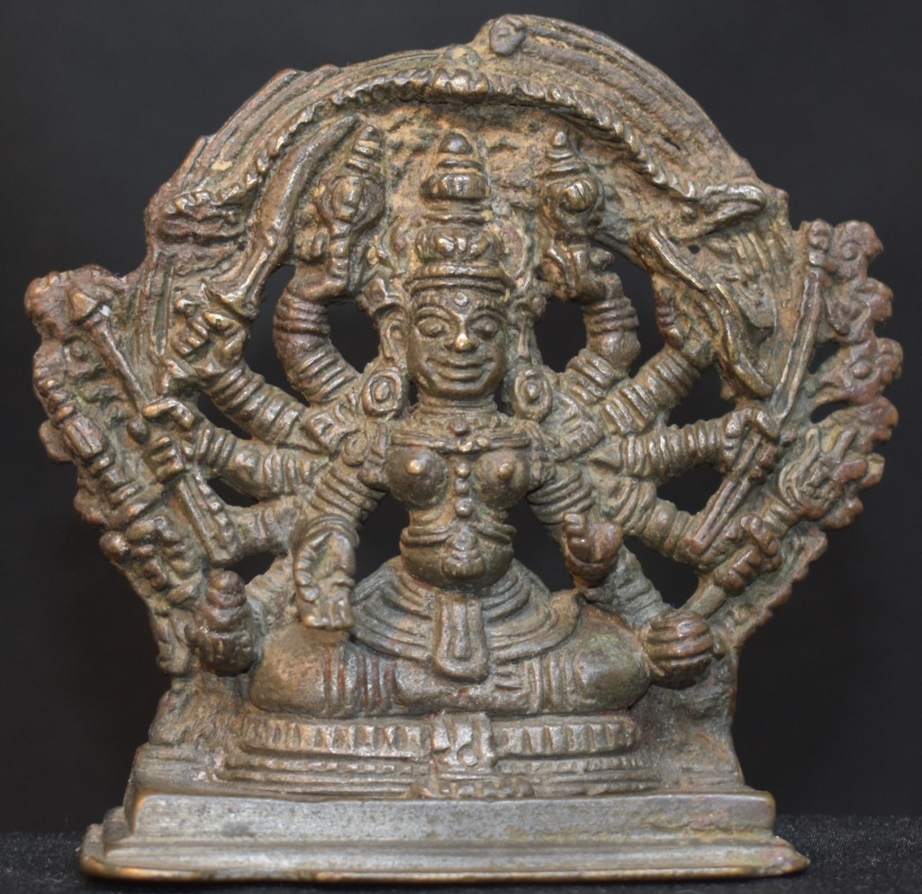 Of special interest is the garland like decoration (or is it a snake?), above her her head and between the sickle and the shield. You see a similar feature in very early dancing Shiva vigrahas with Shiva holding a cobra with his uppermost hands. Some consider that to be a precursor to the Prabhavali.