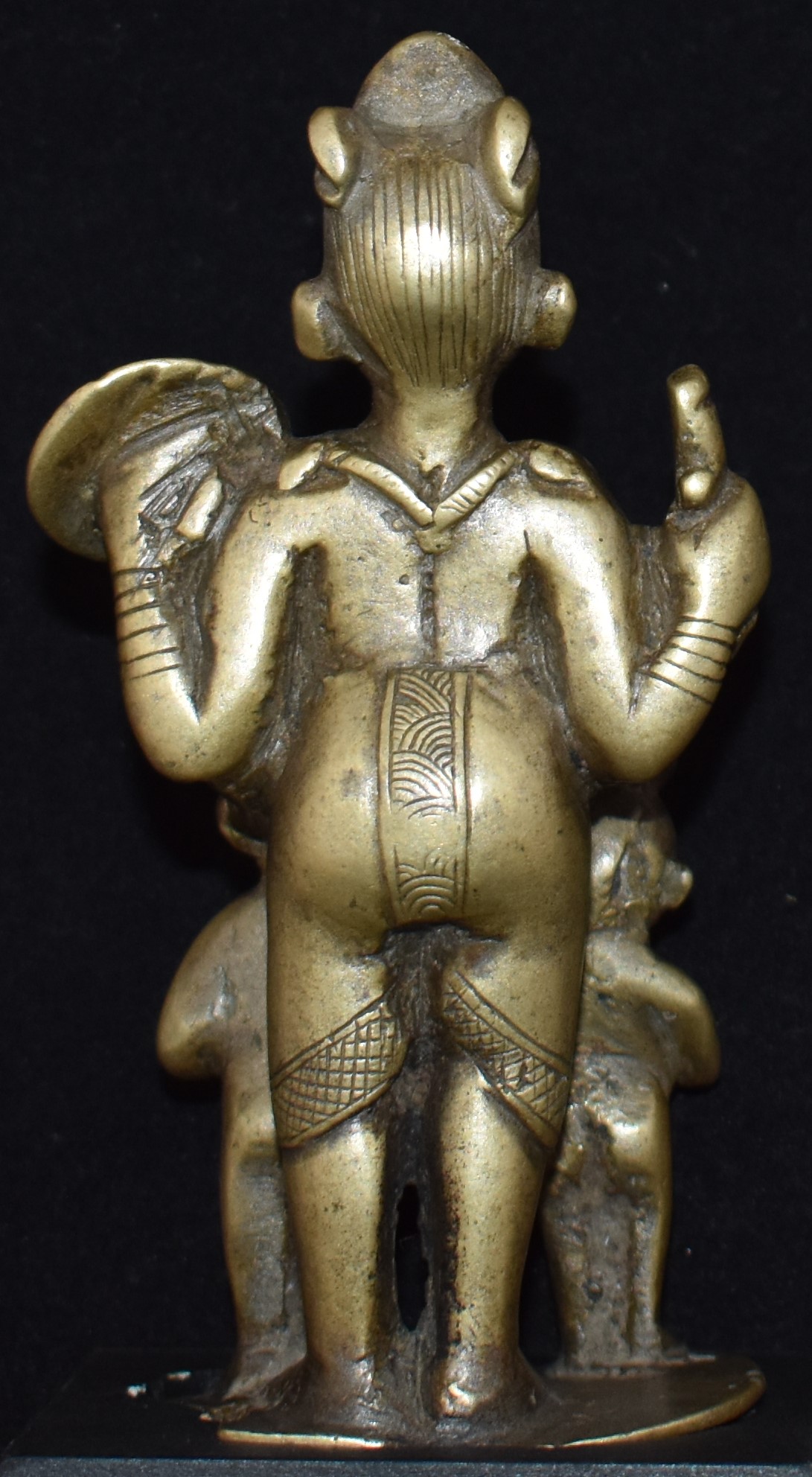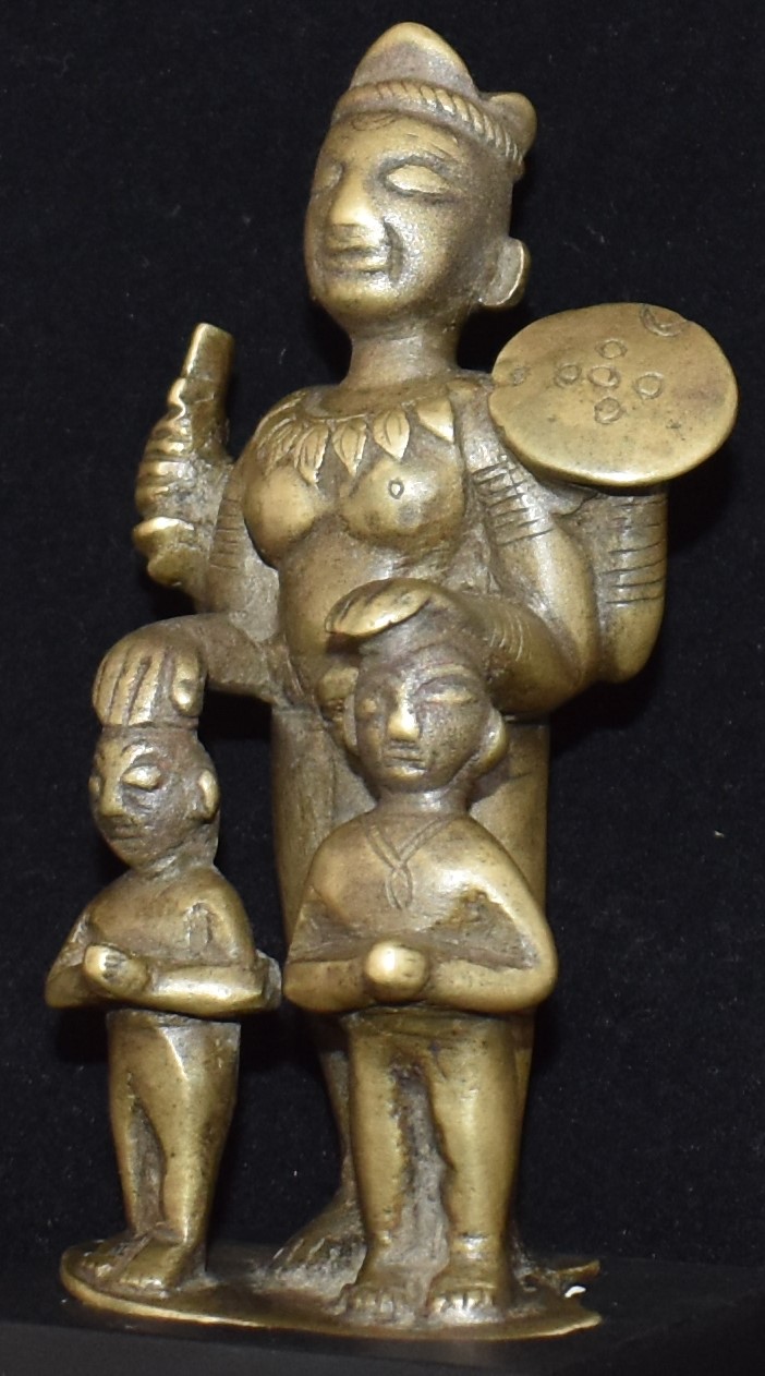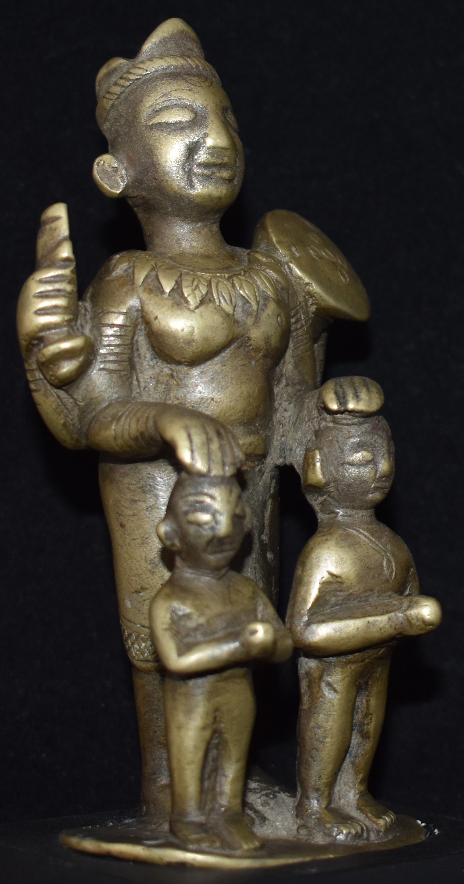 Bought this bronze thinking it could be Vishnu, holding a mace (broken) and chakra, with some form of ayudha purushas in front. That changed quickly when I noticed the crescent moon on the shield. Hence the research.