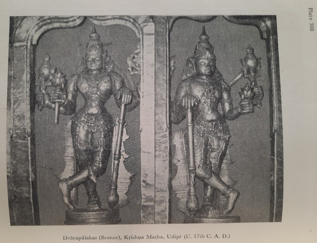 Normally the hand gestures are either Abhaya (protection) mudra, Tarjani mudra (warning) or Vismaya (expressing wonder of the deity in the Sanctum). Here the pose is welcoming and relaxed unlike that of a guardian and with a show of assurance with his hand on the hip. An unusual posture and that got me to search for a similar Dwarapala. Found one, a relief carving on a pillar of the entry Mantap of Hazare Rama temple. Hampi. The photo below is from the book Studies in Tuluva History and Culture By Dr Gururaja Bhatt.