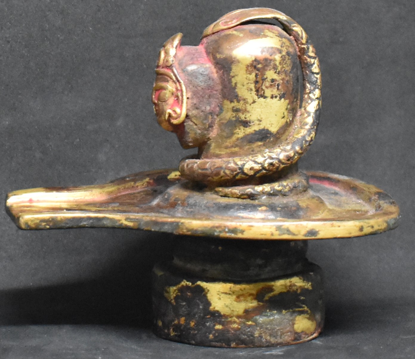 This Linga is the aniconic form of Shiva. What makes this Vigraha unusual are the face (single face and hence Ek Mukh) and the cobra wrapped around the central portion. The facial features help us in identifying its origin, in this case, Nepal.