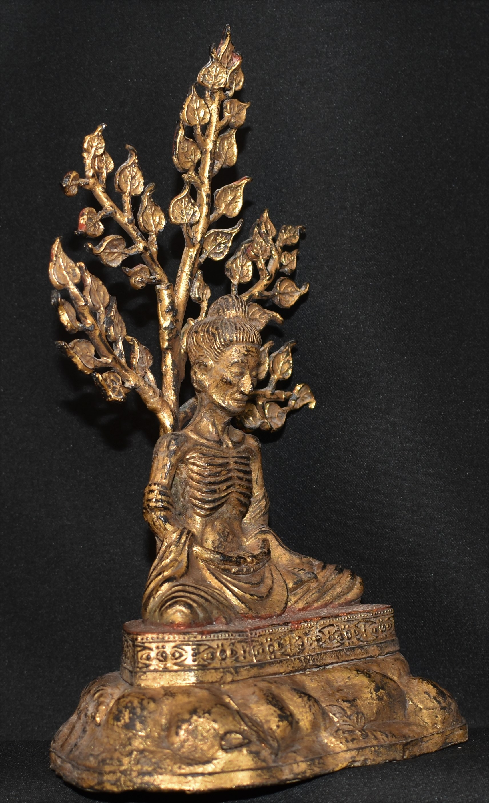 This gilded Vigraha is about 21.5 cm in height. It may be dated to the nineteenth century and attributed to Rattanakosin period. It is rare to emaciated Buddha under a tree. Thanks to Edmond and Patrick for the information on Rattankosin attribution.