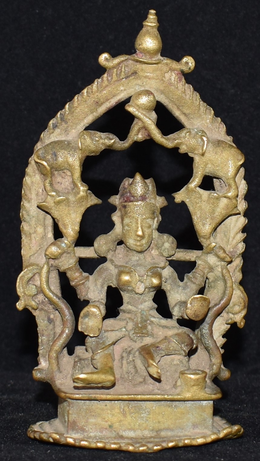 Here, Gajalakshmi and the elephants are framed by prabhavali. The Kalasa on top of Prabhavali is typical of Eastern India. There is a container on the pedestal placed on Gajalakshmi’ s left. The purpose of the container is not known to me.