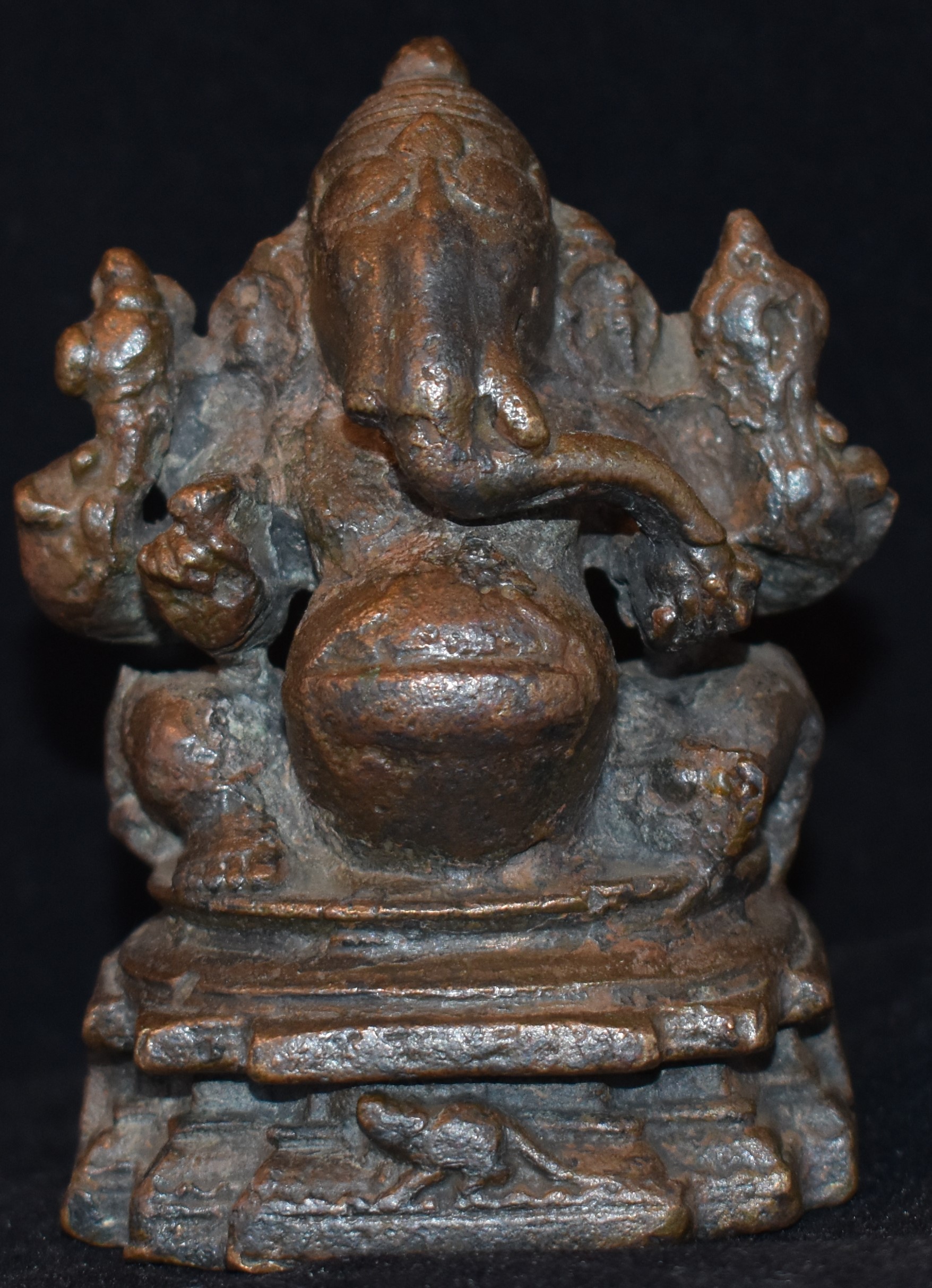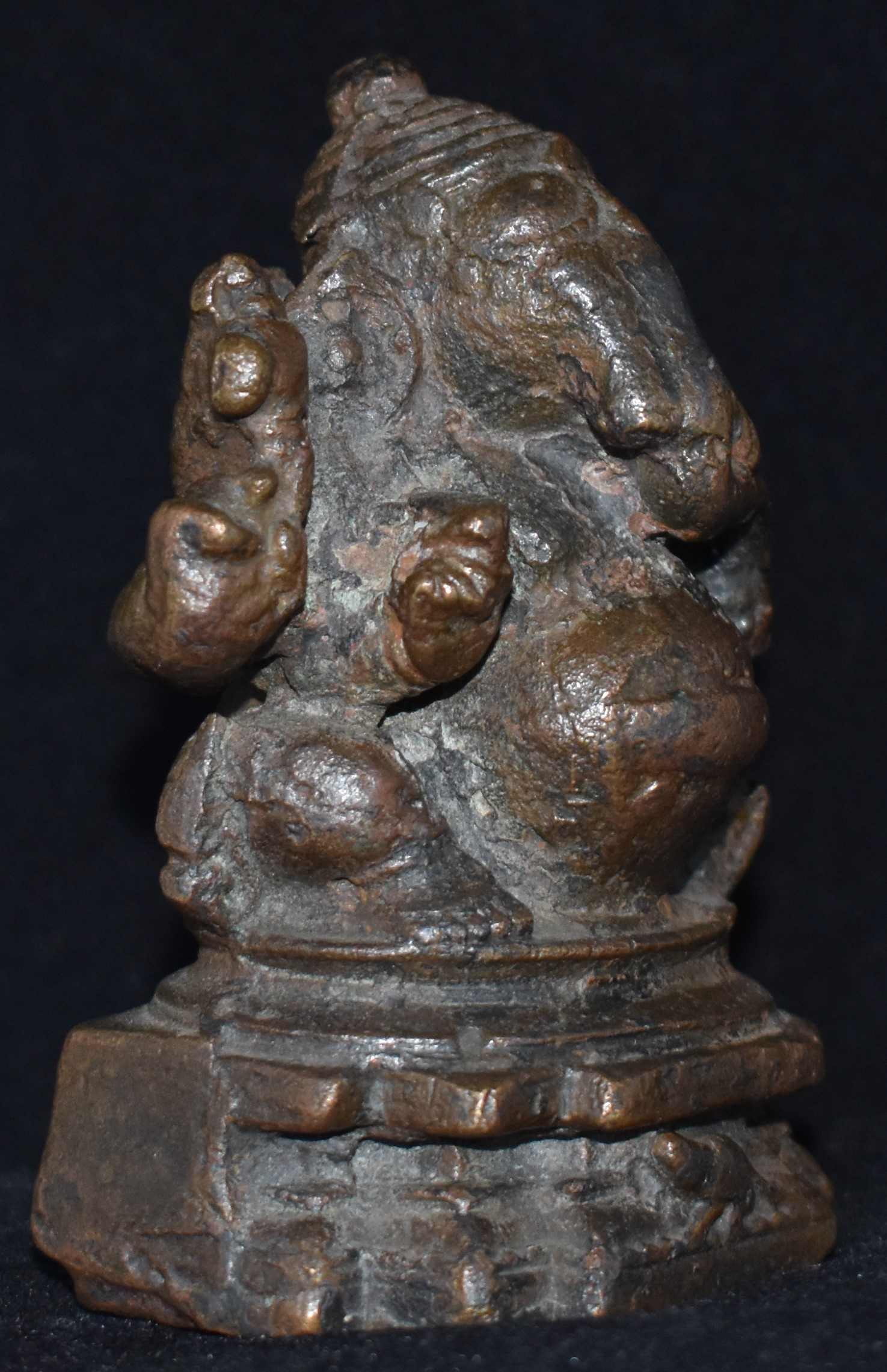 It appears to be single cast, the idol and base cast together. Ganesha is holding broken tusk, battle axe, noose and sweet meat in his hands, starting from lower right clockwise. Typical attributes that you see in South Indian Ganesha. His large belly and the way he is sitting letting his belly rests on the pedestal is charming. He is wearing a crown with an unusual design, stepped with concentric circles.