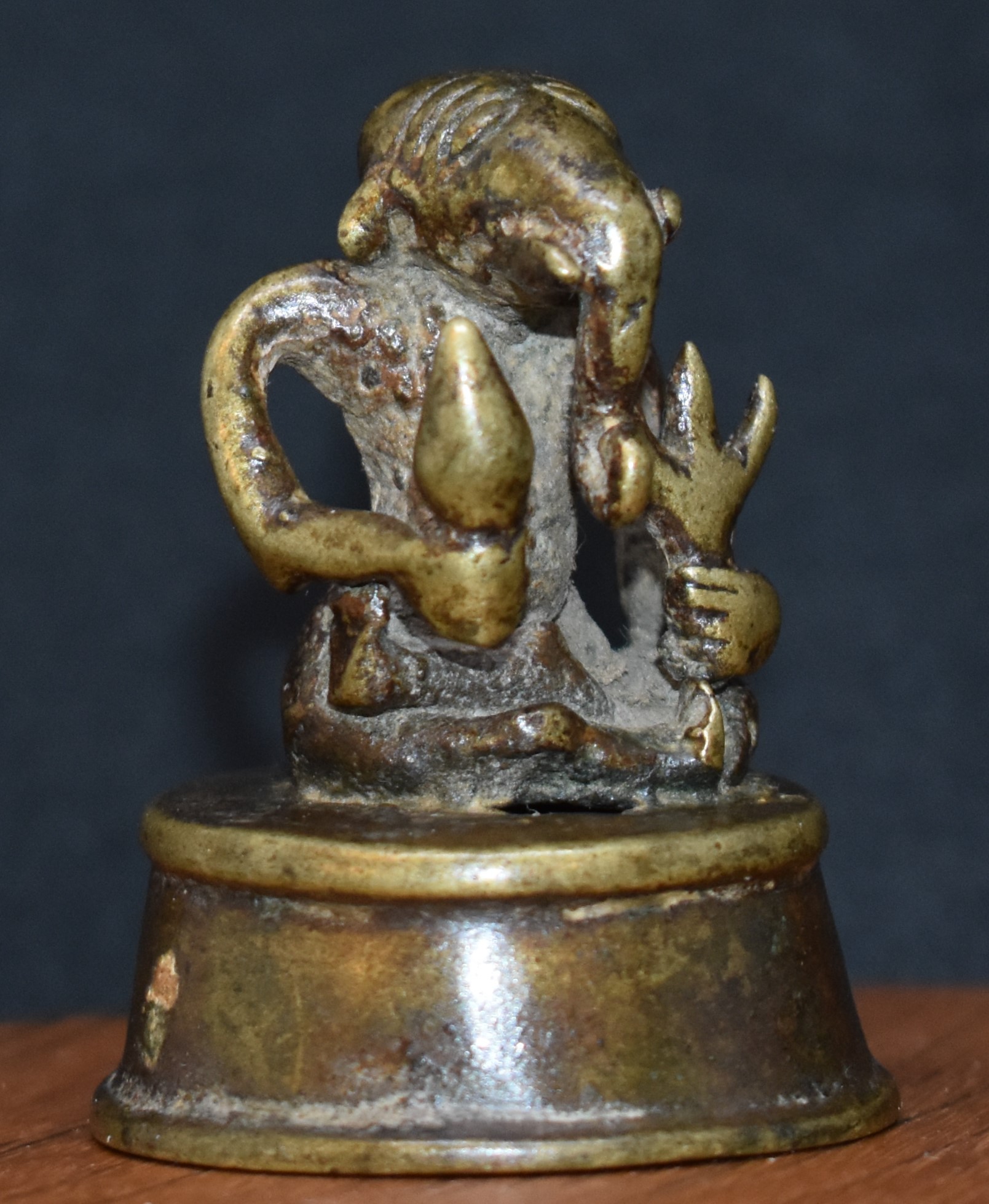 Holding of Trishul, the trunk’s position, the cylindrical pedestal, and two arms are the unusual aspects of this Ganesha.