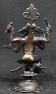 Four-armed Ganesha is sitting on a mouse (See the rear view), his vahana. The mouse, in turn, is supported by a hemispherical base with a rim.