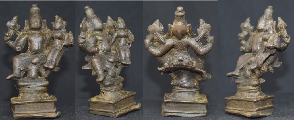 This bronze is about 10 cm in height and may date prior to the sixteenth century. One of my dealer friends had a similar Vigraha and he had attributed it to the Pallava-Chola transition period. This Vigraha is from Tamil Nadu.