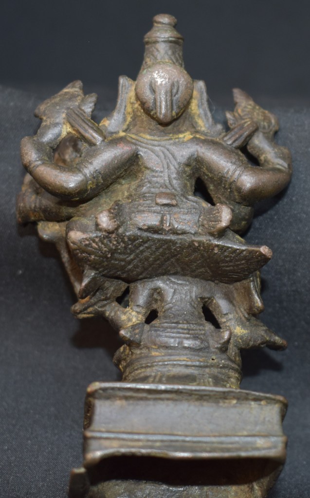 Garuda is sitting in Ardhapadmasana with his hands outstretched. The spread wings of Garuda are usually meant to show him in flight, carrying Vishnu. But in this case, Vishnu is sitting on Garuda’s spread wing, see the back view. Garuda’s hands are supporting Vishnu’s feet.