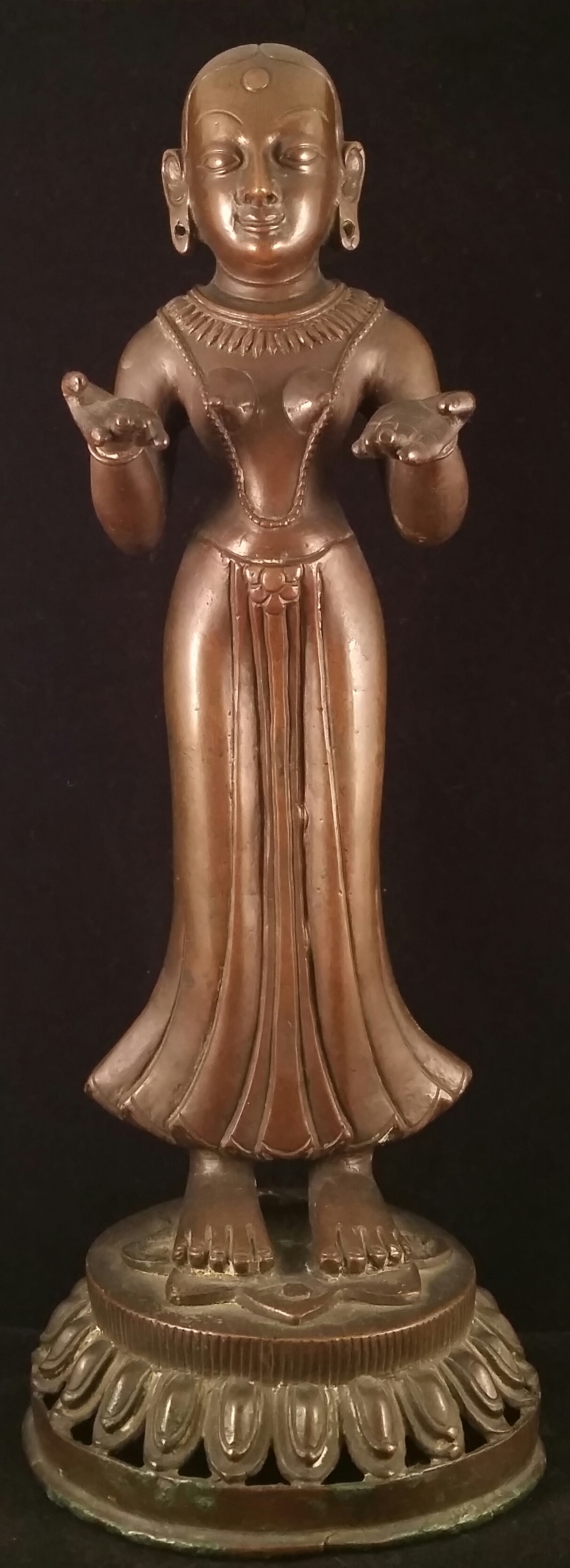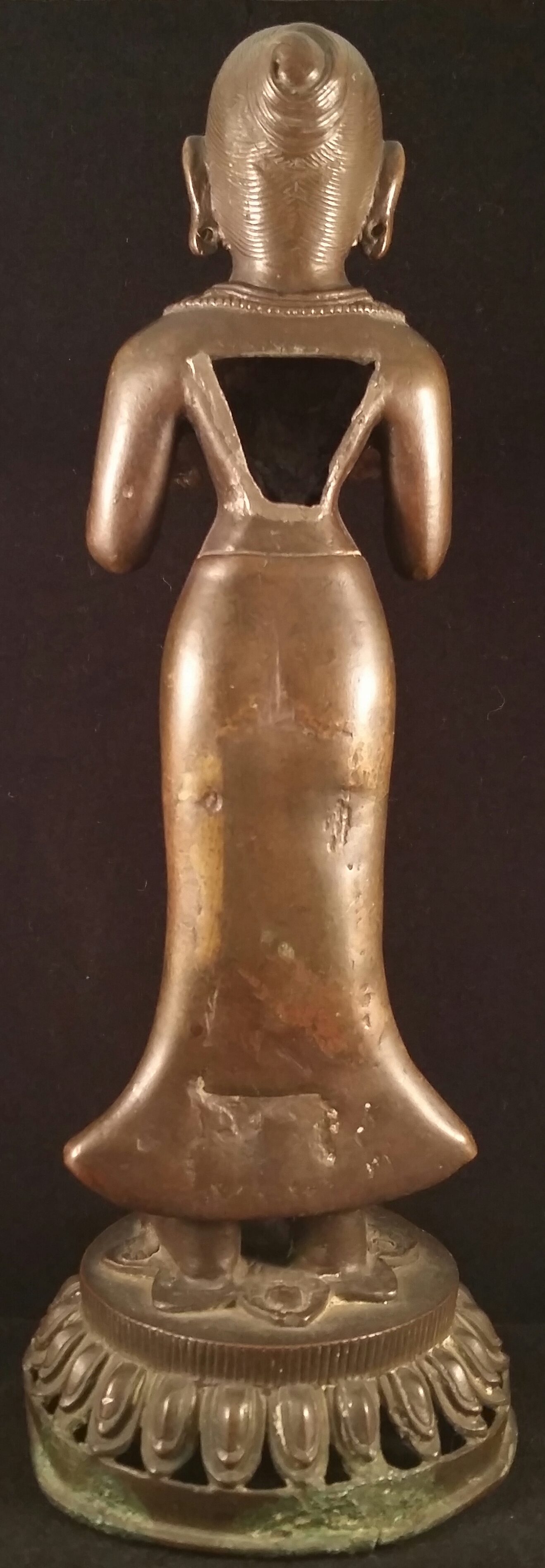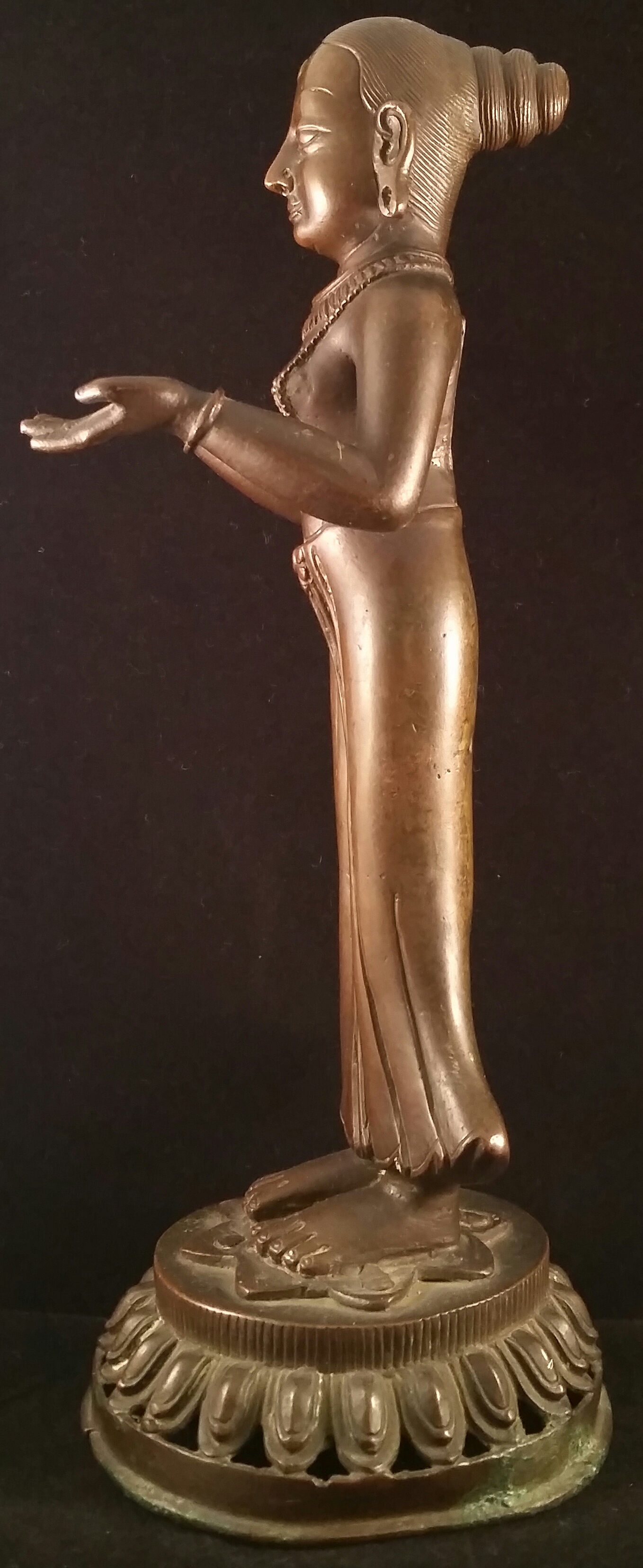 She is standing on a lotus, signifying a goddess. The open arms stretched in front of her almost suggest Deepalakshmi. The cut portion on her back and the sealed portion at the back of the lower garment may be consecration-related, suggesting a Buddhist origin.