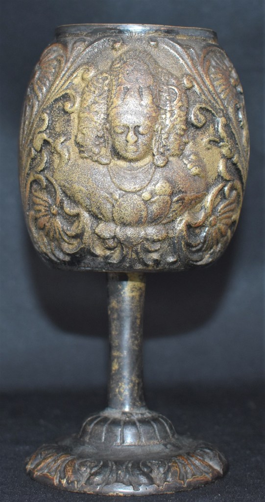 It is an assembled piece, involving at least four parts. The two halves of the goblet, the stem including the bottom of the goblet and the base. You can see the welding joints as whoever made it did not take the trouble to hide the joints.