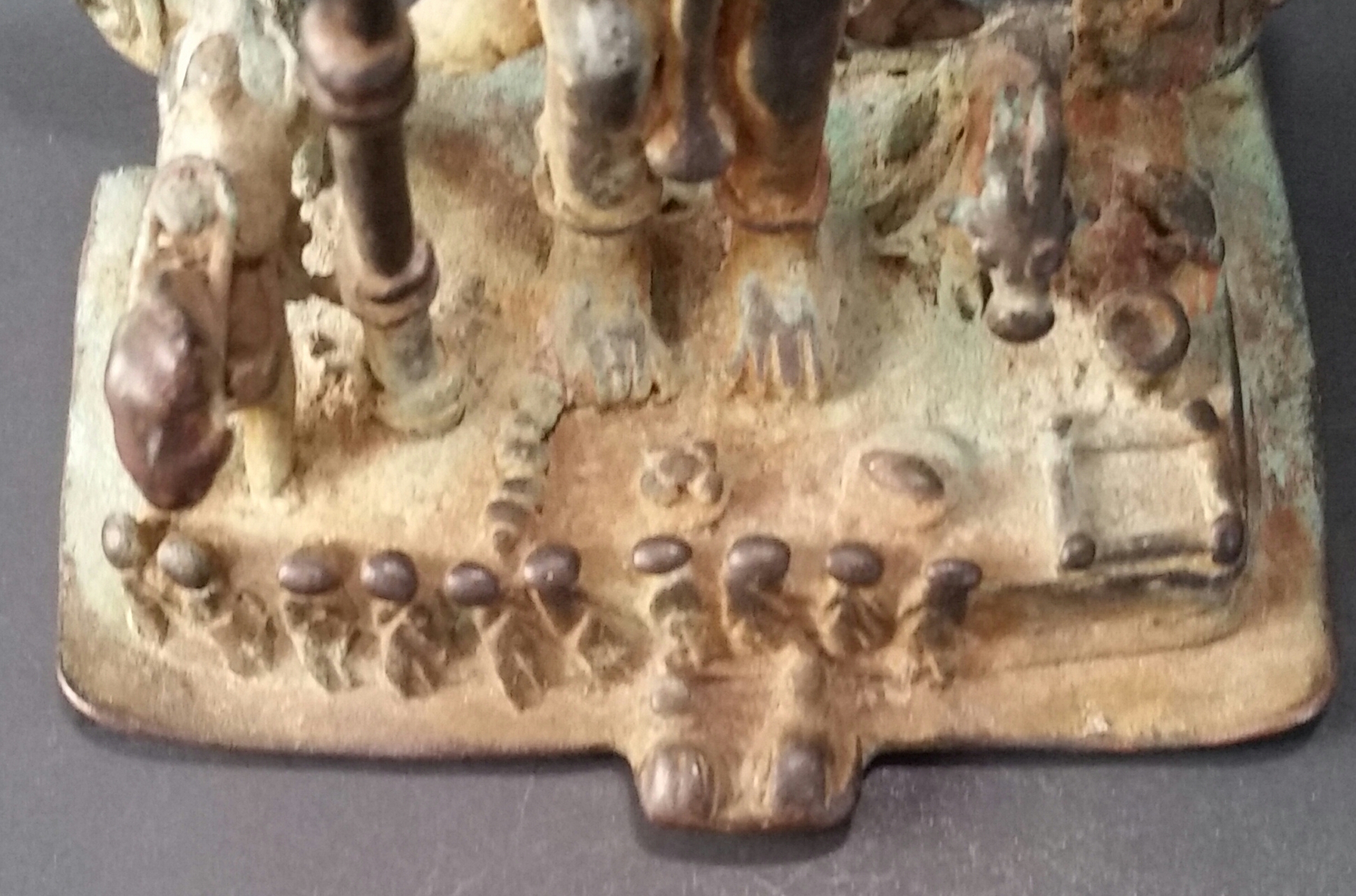 There is very little information regarding the significance of the figures on the base. In this example, the figures include a Ram, a heap of five spherical objects, Linga, a square, a cup, a tortoise and a ram. In front of the base, you see ten human-like figures and a pair of feet.
