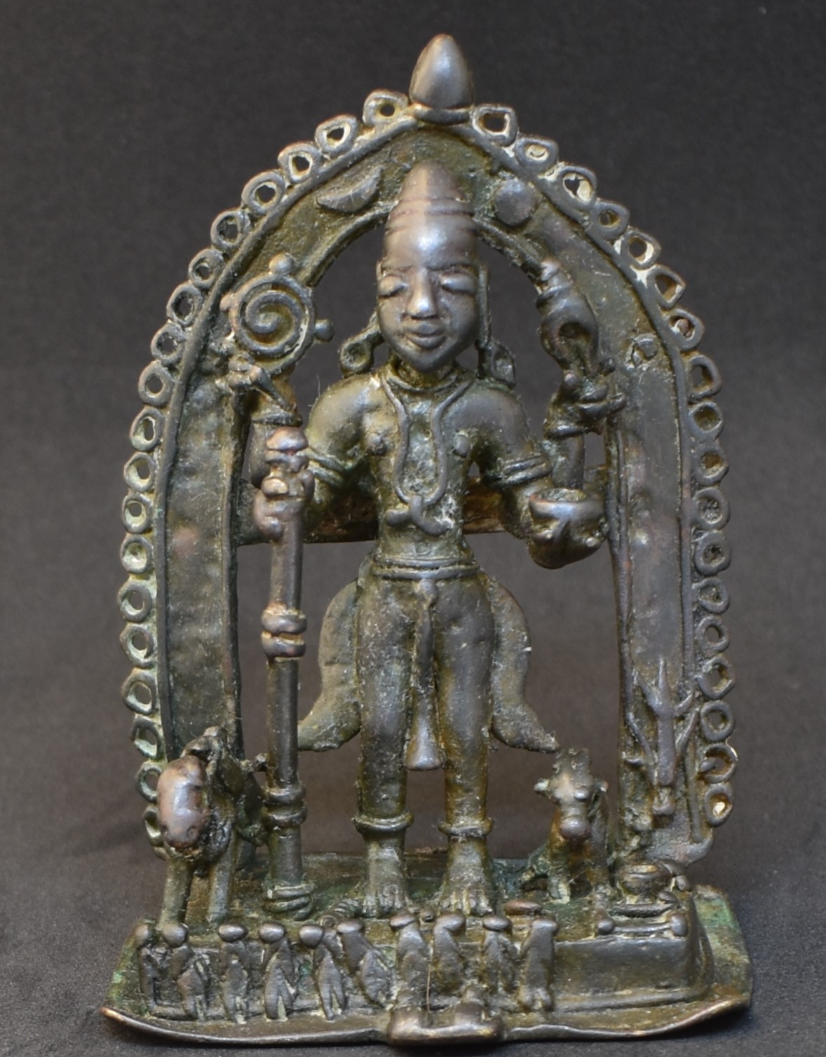 This is Govinda Bhairava, a syncretic form of Vishnu (Govinda) and Shiva (Bhairava). His rear hands are holding Vishnu’s attributes, Chakra and Shankha. Staff and begging bowl in the lower hands are Shiva’s attributes. This is similar to another Govinda Bhairava on this site. This bronze is more tribal in nature as opposed to the folkish style of the other bronze.